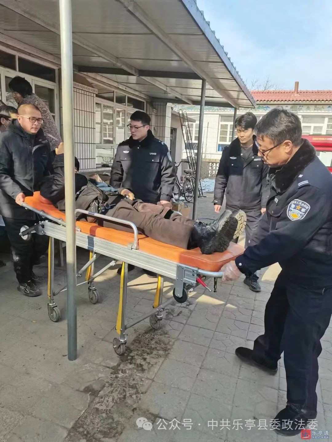 2024年01月10日,乐亭县公安局胡家坨派出所民辅警在辖区街面开展“110”警务宣传时,有群众报警求助称:商贸街南侧卫生所门口有一位大爷突发疾病,神志不清,躺在地上一动不动,闻讯,所有人立即前往查看。