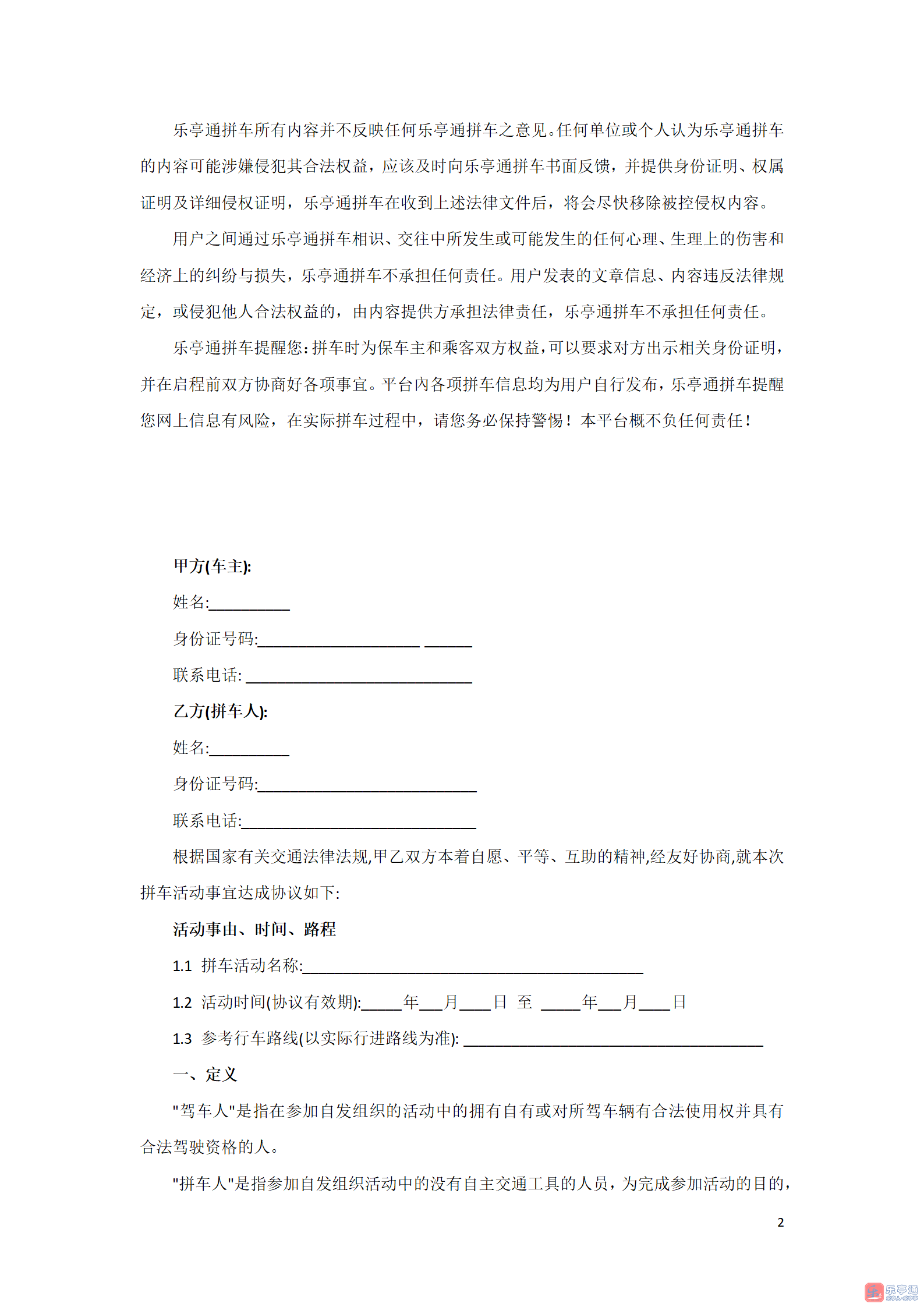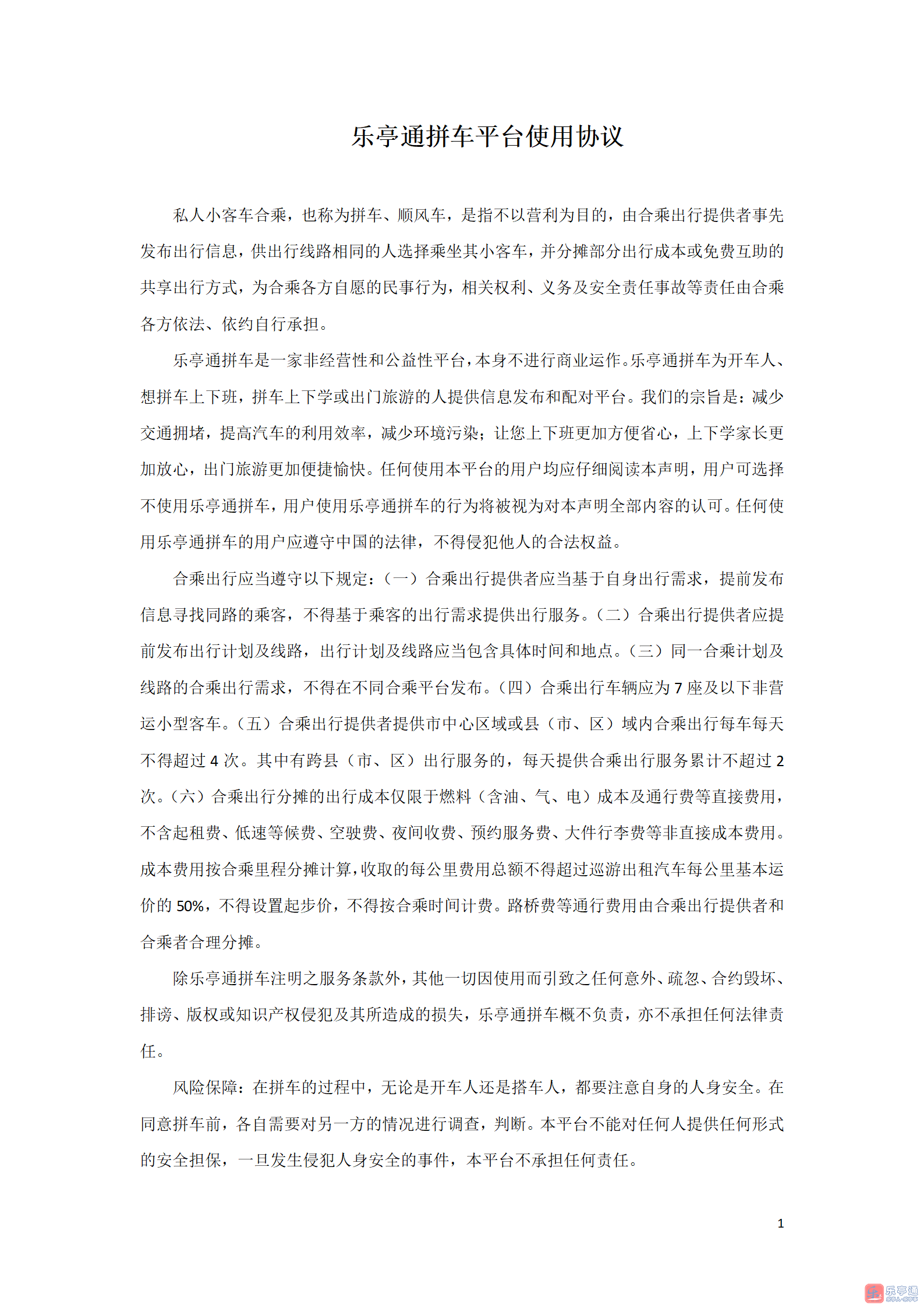 乐亭通拼车网是一家非经营性和公益性平台,本身不进行商业运作。乐亭通拼车网为开车人、想拼车上下斑,拼车上下学或出门旅游的人提供信息发布和配对平台。我们的宗旨是:减少交通拥堵,提高汽车的利用效率,减少环境污染;让您上下班更加方便省心,上下学家长更加放心,出门旅游更加便捷愉快。任何使用本平台的用户均应仔细阅读本声明,用户可选择不使用乐亭通拼车网,用户使用乐亭通拼车网的行为将被视为对本声明全部内容的认可。任何使用乐亭通拼车网的用户物应遵守中国的法律,不得侵犯他人的合法权益。
