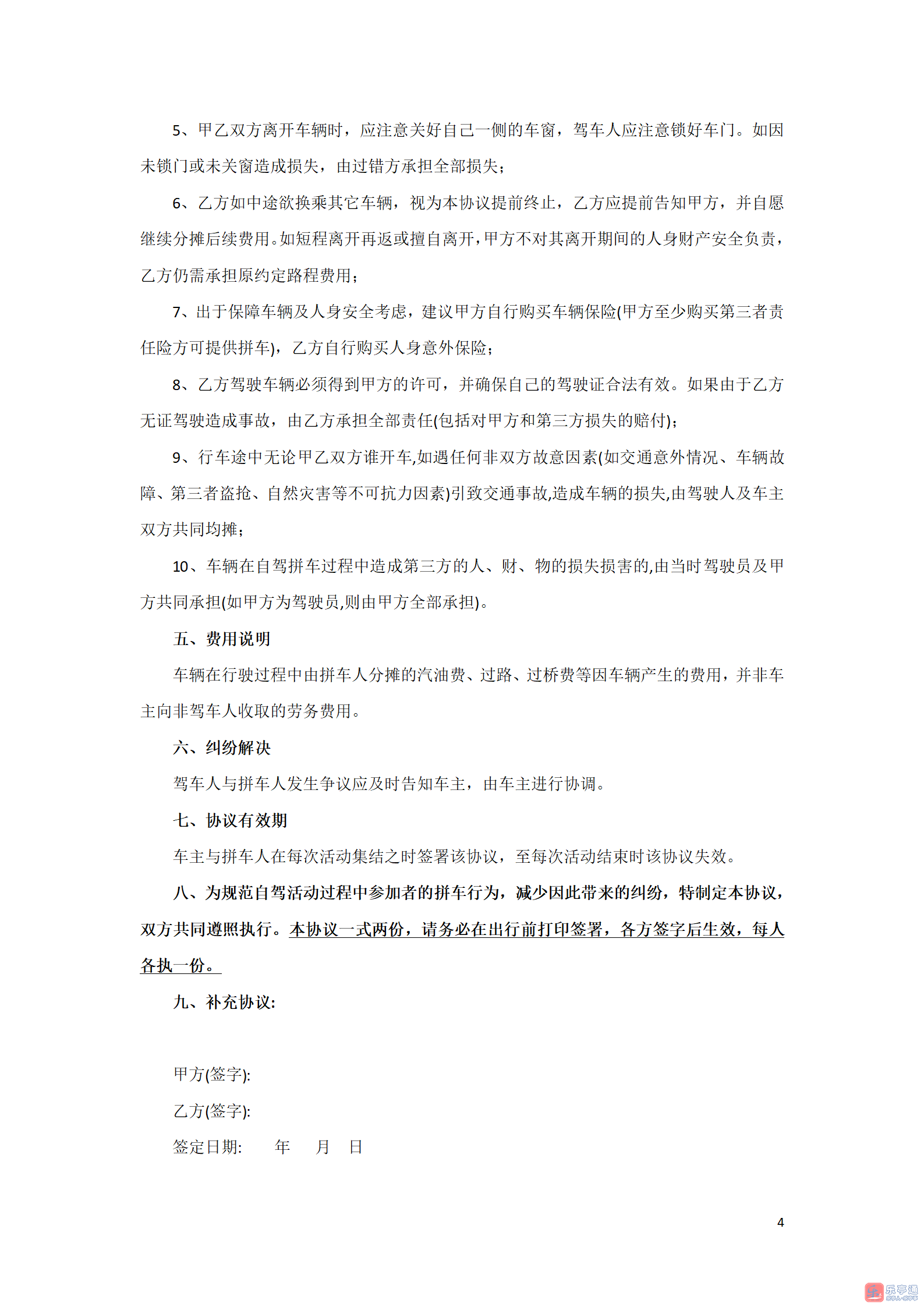 用户之间通过乐亭通拼车网相识、交往中所发生或可能发生的任何心理、生理上的伤害和经济上的纠纷与损失,乐亭通拼车网不承担任何责任。用户发表的文章信息、内容违反法律规定,或侵犯他人合法权益的,由内容提供方承担法律责任,拼车网不承担任何责任。