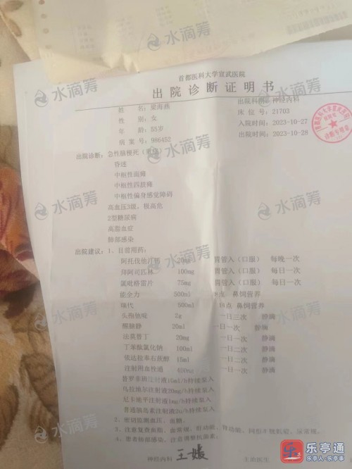 大家好,我是陈继军,我妻子今年56岁,名叫梁海燕,河北省唐山市乐亭县人,我们本是一个幸福的家庭,家里有两个女儿,老大工作了,老二还在上学!在我的爱人没有生病的时候,我们一家人生活也非常幸福美满,疾病来的让人措不及防,23年10月23号发病在当地医院看了2天25号转到北京,被诊断为:急性脑梗死
