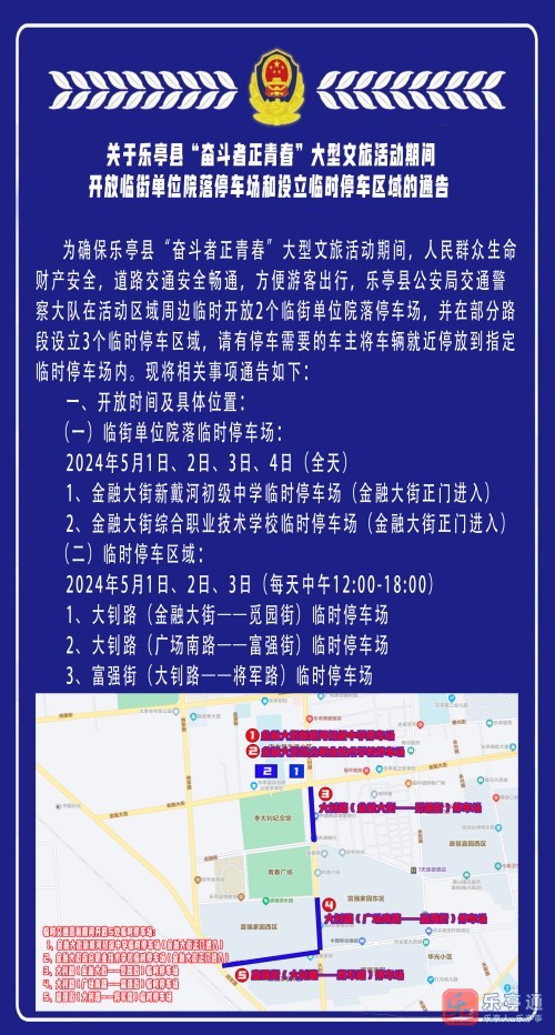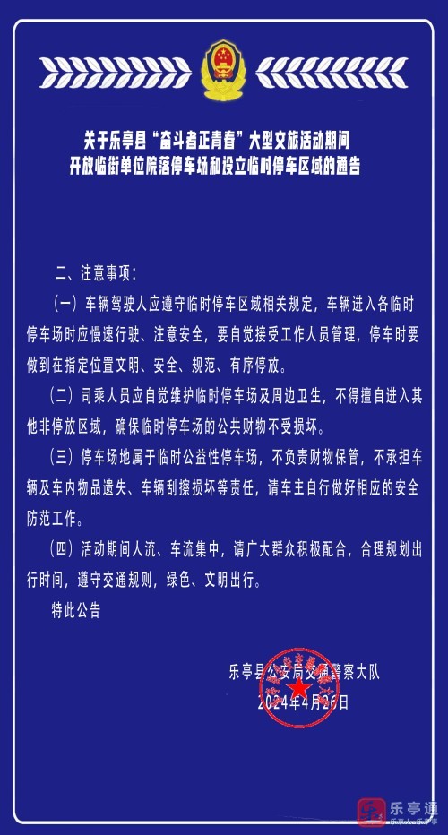 为确保乐亭县“奋斗者正青春”大型文旅活动期间,人民群众生命财产安全,道路交通安全畅通,方便游客出行,乐亭县公安局交通警察大队在活动区域周边临时开放2个临街单位院落停车场,并在部分路段设立3个临时停车区域,请有停车需要的车主将车辆就近停放到指定临时停车场内。现将相关事项通告如下: