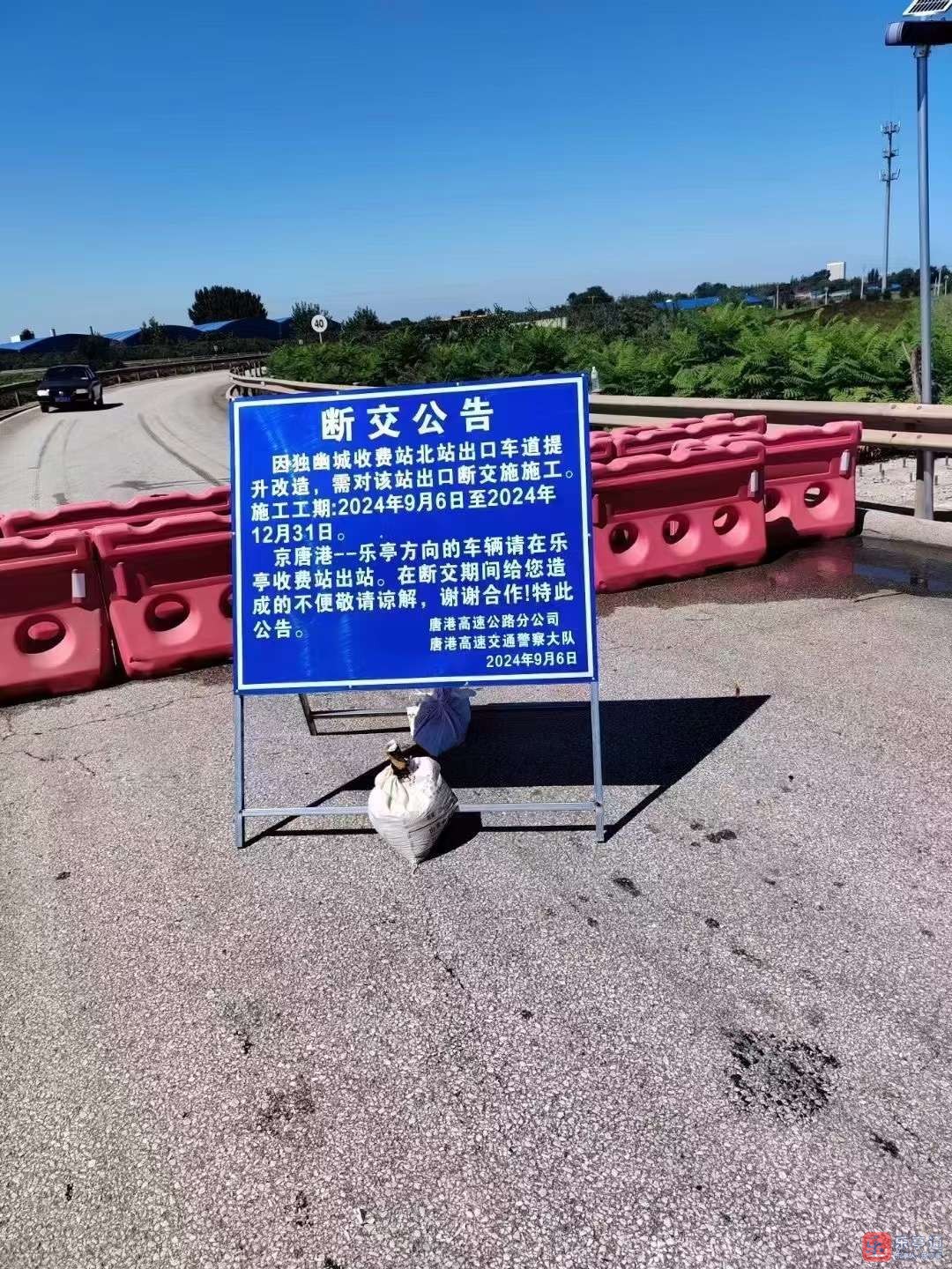 因独幽城收费站北站出口车道提升改造,需对该站出口断交施施工。施工工期:2024年9月6日至2024年12月31日。京唐港--乐亭方向的车辆请在乐亭收费站出站。
