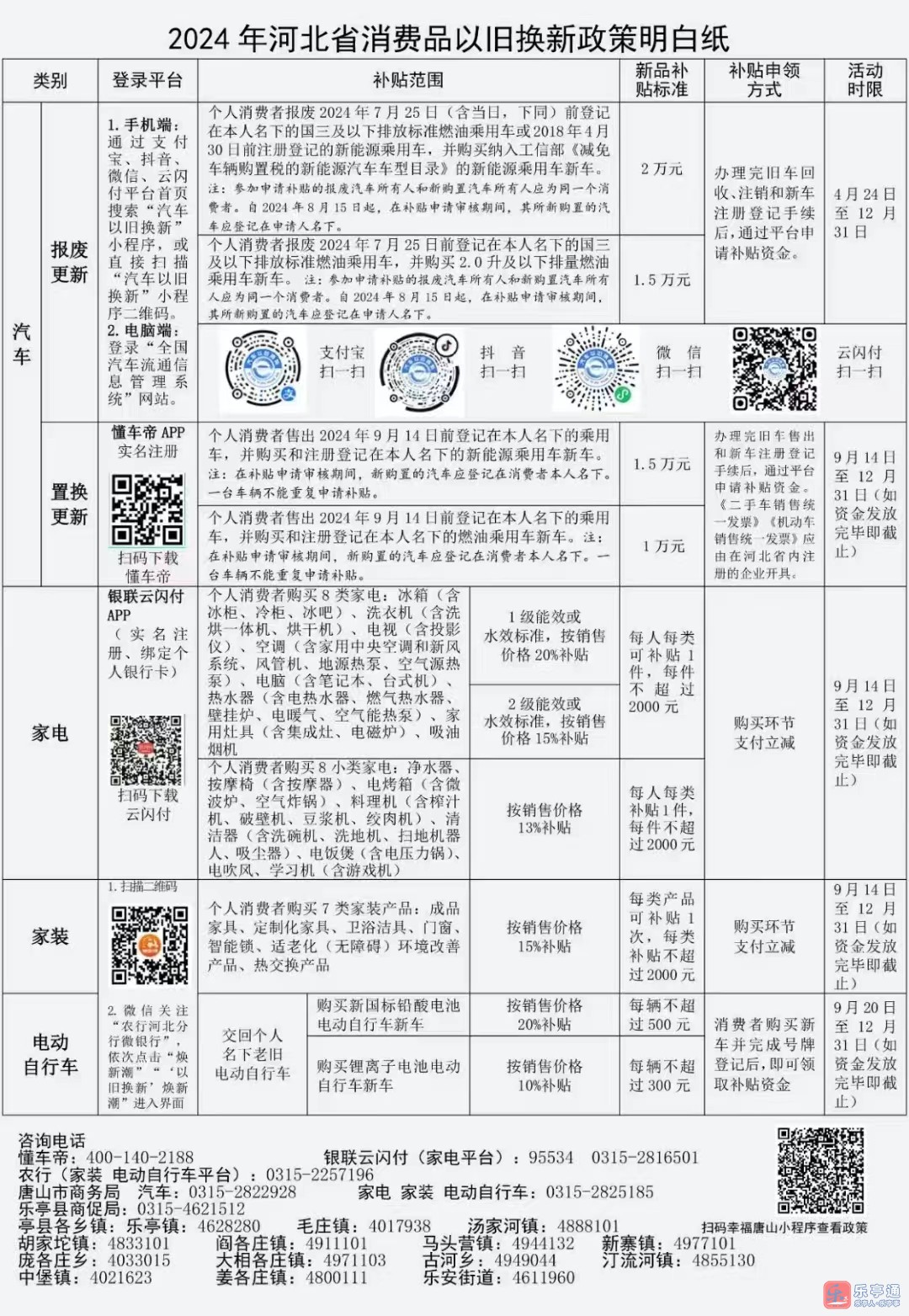 2024年9月14日0时至2024年12月31日24时1.对消费者购买1级能效或水效标准的冰箱(含冰柜、冷柜、冰吧)、洗衣机(含洗烘一体机、烘干机)、电视(含投影仪)、空调(含家用中央空调和新风系统、风管机、地源热泵、空气源热泵)、电脑(含笔记本、台式机)、热水器(含电热水器、燃气热水器、壁挂炉、电暖气、空气能热泵)、家用灶具(含集成灶、电磁炉)、吸油烟机等8类家电产品(以下简称“8类家电”),按照销售价格(产品剔除所有折扣优惠后的成交价格)的20%予以补贴;购买2级能效或水效标准“8类家电”的,按照销售价格的15%予以补贴。每人每类可补贴1件,每件补贴不超过2000元。2.对消费者购买净水器、按摩椅(含按摩器)、电烤箱(含微波炉、空气炸锅)、料理机(含榨汁机、破壁机、豆浆机、绞肉机)、清洁器(含洗地机、洗碗机、扫地机器人、吸尘器)、电饭煲(含电压力锅)、电吹风、学习机(含游戏机)等8小类家电,按照销售价格的13%予以补贴,每人每类可补贴1件,每件补贴不超过2000元。以消费立减方式对消费者进行资金补贴。消费者登录云闪付App完成身份认证并领取消费资格码(三日内有效,资格码失效后可重新申领),凭资格码在承办企业购置产品时,按产品相应补贴标准完成立减。乐亭家电以旧换新活动