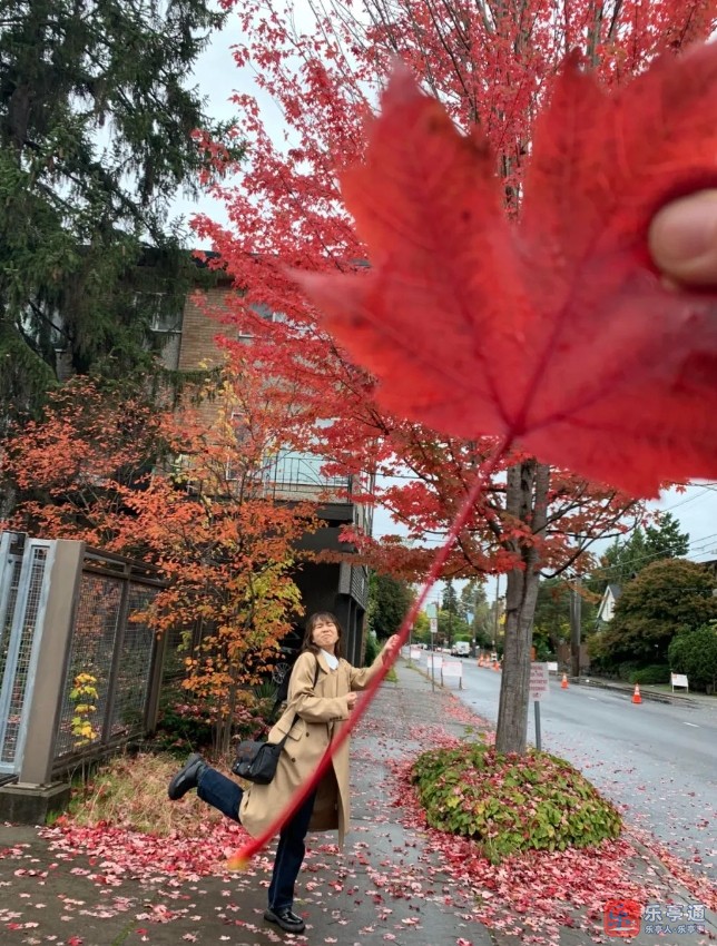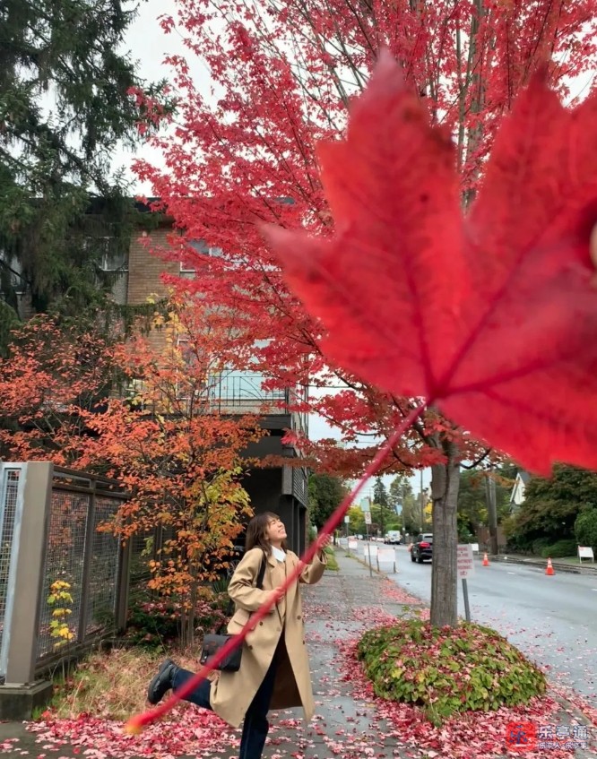 人在后面,枫叶在前面,这样简单拍出来的照片,就有巨大枫叶的效果啦,这是最简单的方法,却能发酷酷的朋友圈。