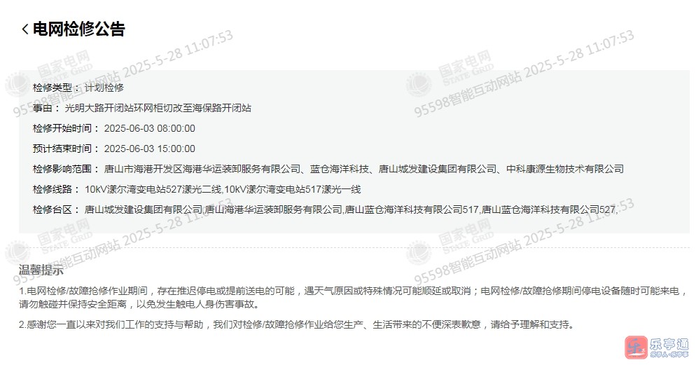 1.电网检修/故障抢修作业期间,存在推迟停电或提前送电的可能,遇天气原因或特殊情况可能顺延或取消;电网检修/故障抢修期间停电设备随时可能来电,请勿触碰并保持安全距离,以免发生触电人身伤害事故。
