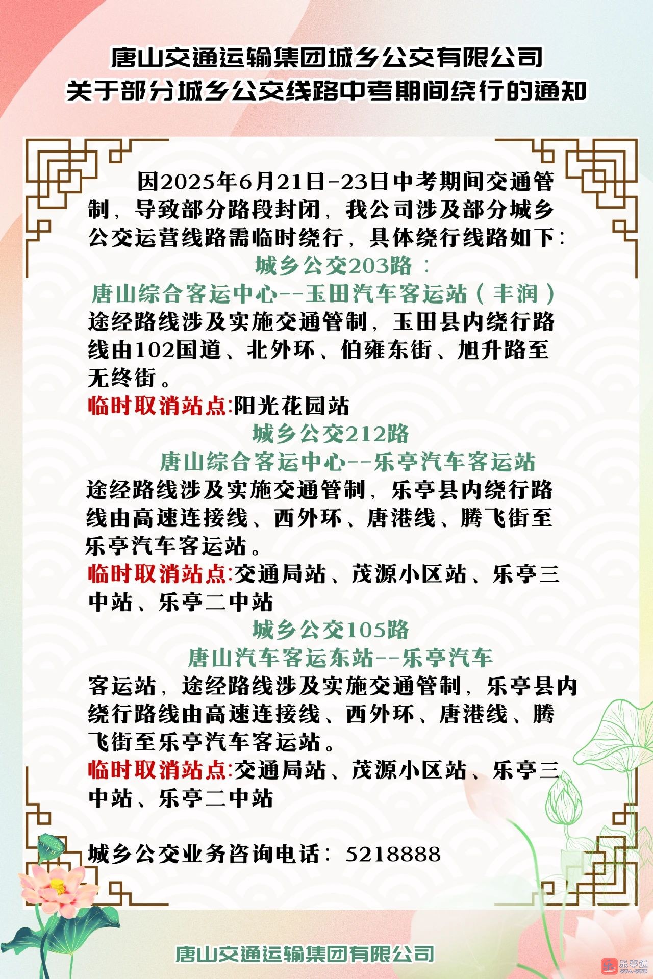 扩散!唐山↔乐亭城乡公交部分线路,中考期间绕行通知!