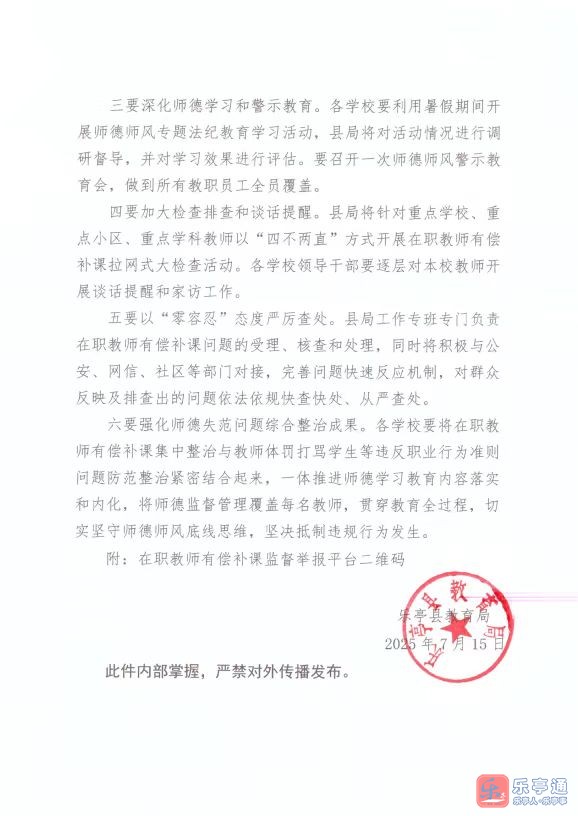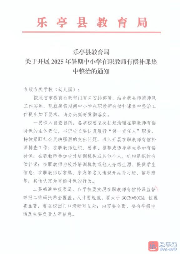 乐亭:关于开展2025年暑期中小学在职教师有偿补课集中整治的通知