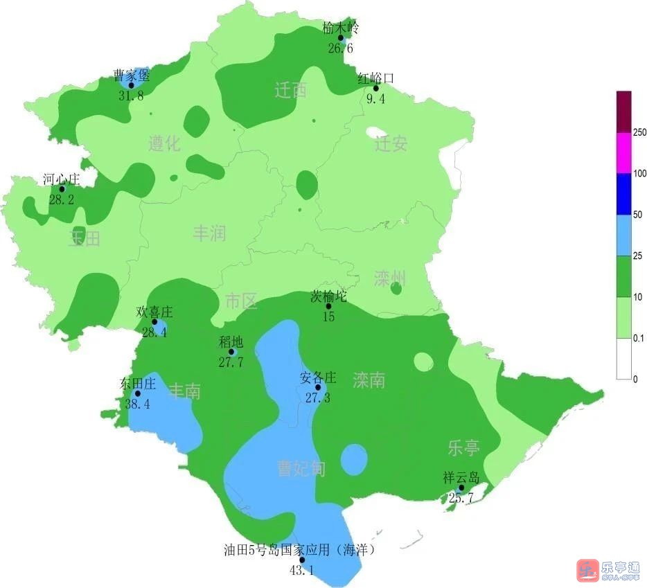 受副高外围暖湿气流影响,15日白天到夜间,我市出现雷雨天气,北部小雨,局地中雨到大雨,南部中雨到大雨。15日7时-16日7时,全市大雨站33个,中雨站131个,小雨站207个,平均降水量为10.8毫米,最大降水量为曹妃甸油田5号岛43.1毫米,最大小时雨强为丰南东田庄25.7毫米/小时。市区及各县区降水量统计见表1。