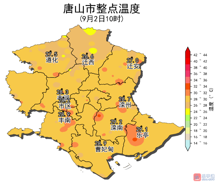 今日10时,我市南部沿海地区气温较高,普遍在29~32℃之间,其中乐亭马头营最高,达32.7℃;北部地区气温较低,多在22~27℃左右,最低为遵化洪山口22.4℃。和昨日同时刻相比,大部分地区气温波动幅度较小,升降幅度普遍不足1℃。
