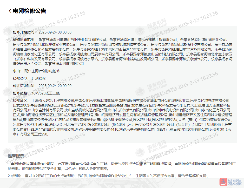 检修影响范围: 乐亭县汤家河镇唐山首钢宝业钢铁有限公司、乐亭县汤家河镇上海泓云建筑工程有限公司、乐亭县汤家河镇朗烨焦化公司、乐亭县汤家河镇河北省澳航实业有限公司、乐亭县汤家河镇唐山宝航机械制造有限公司、乐亭县汤家河镇唐山诚佑科技有限公司、乐亭县汤家河镇唐山腾驰石化科技发展有限公司、乐亭县汤家河镇上海电气风电设备河北有限公司、乐亭县汤家河镇唐山京宝涂料有限公司、乐亭县汤家河镇唐山泰岳化工有限公司、乐亭县汤家河镇唐山元展涂料有限公司、乐亭县汤家河镇唐山诚佑科技有限公司、乐亭县汤家河镇北京生态家园(乐亭)科技发展有限公司、乐亭县汤家河镇污水泵站、乐亭县汤家河镇地城实业改网畅公司、乐亭县汤家河镇乐亭燃气公司、乐亭县汤家河镇张伸田水产公司、乐亭县汤家河镇河钢公司