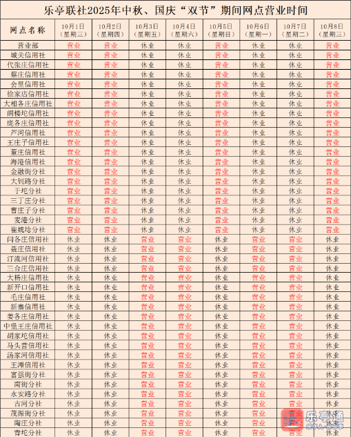 乐亭信用社2025年中秋、国庆“双节”期间网点营业时间公告