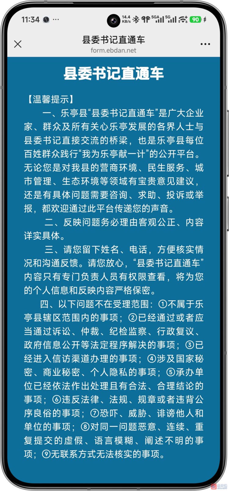 此次乐亭通平台接入 “县委书记直通车”,用户无需切换平台,在乐亭通 APP 首页、公众号页面即可便捷访问 “县委书记直通车”,通过简单操作填写诉求类别、联系方式及具体内容,即可完成 “民意直达县委县政府” 的闭环流程 —— 从反映政务服务堵点,到咨询教育医疗政策,再到建言产业发展方向,群众与企业的每一份诉求都能得到高效响应、透明办理。