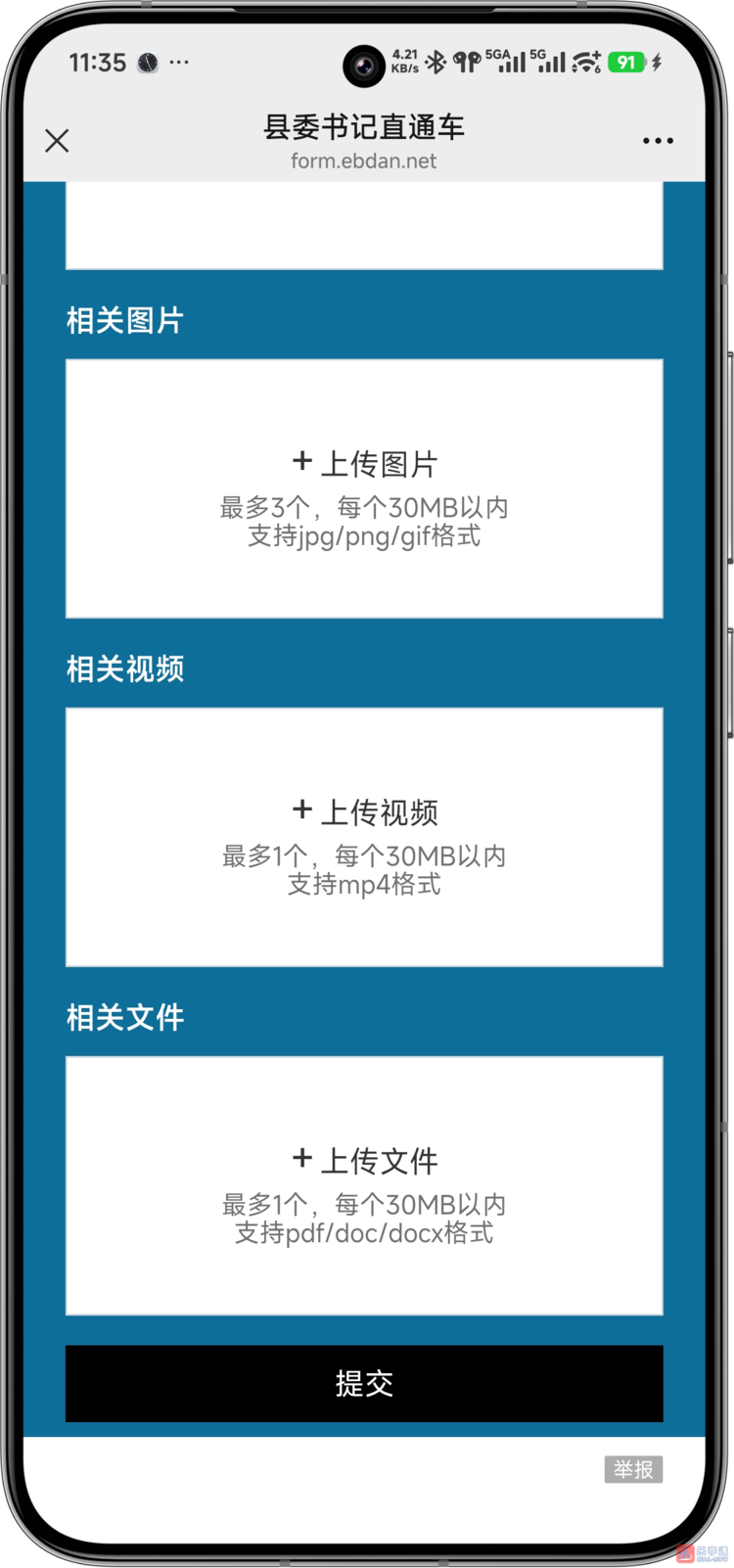 按页面提示依次填写意见类别、姓名、联系电话、单位或住址、我要说、附件等资料→点击上传图片→点击提交按钮即可完成信息的提交