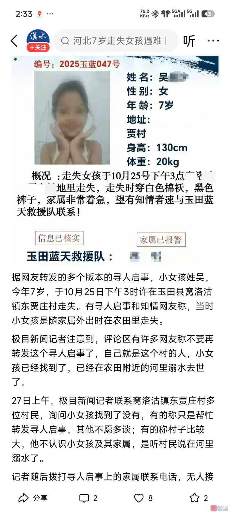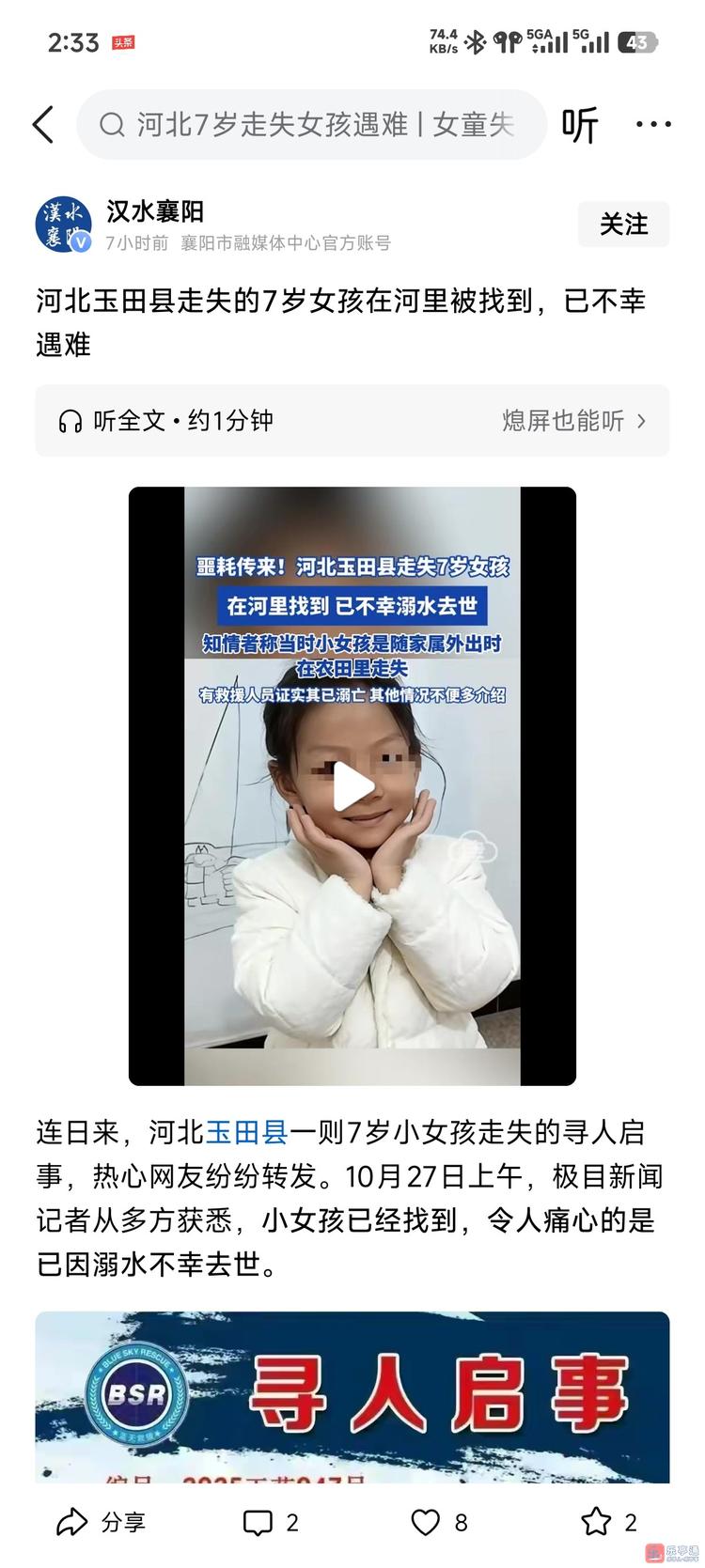 心疼!玉田走失7岁女孩在河里找到,已不幸遇难