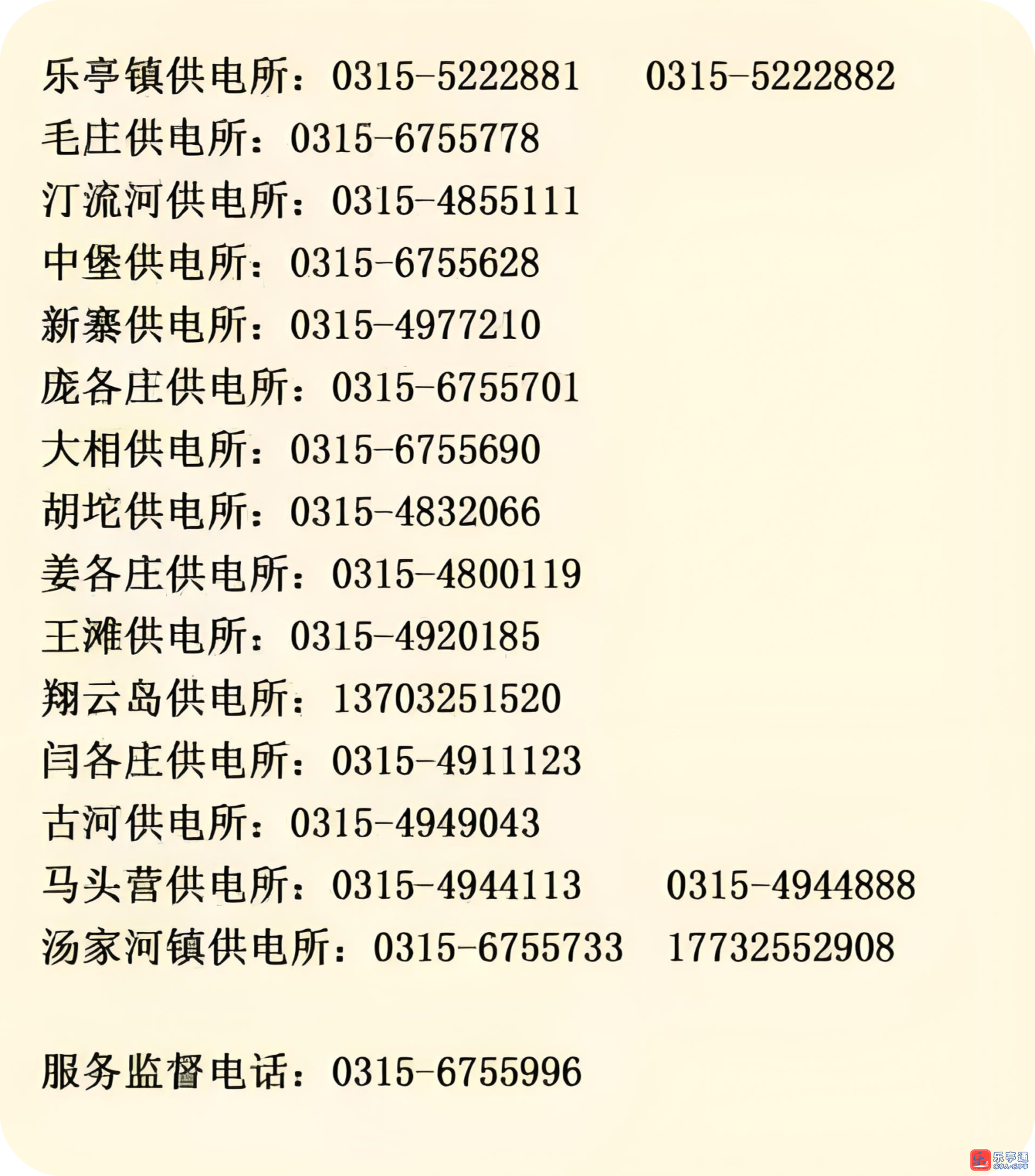 检修影响范围:乐亭县古河乡古河村、乐亭县古河乡葛(戈)庄子村、乐亭县古河乡刘庄子村、乐亭县古河乡大捞渔庄村、乐亭县古河乡赵庄子村、乐亭县古河乡蒋庄子村、乐亭县古河乡西阁楼坨村、乐亭县古河乡江悦大米加工厂公司(江悦米业有限公司)、古河乡亿隆养殖场公司、古河乡古河村鸡场、古河苗圃、溪家坨水利、刘金田
