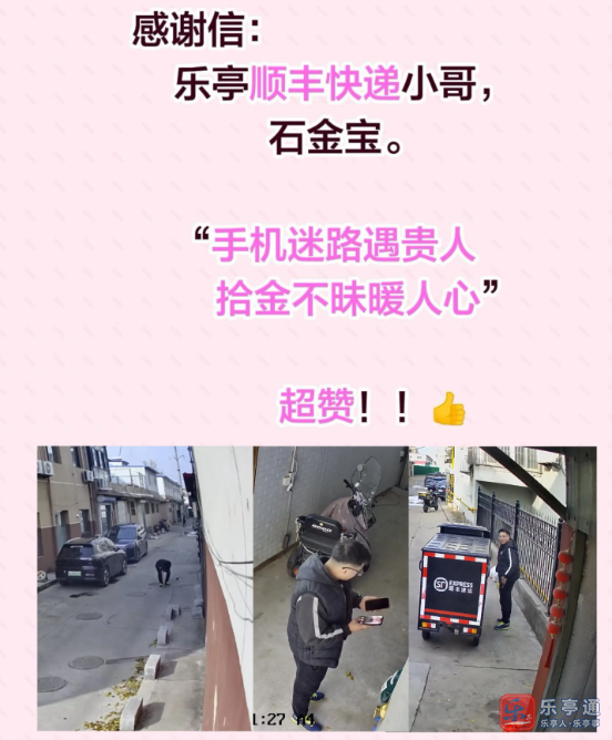 感谢信,感谢乐亭顺丰小哥石金宝。今天下午两点多,家人下楼匆忙,一部苹果手机丢在了我们门口胡同的过道上,正好上门取件的顺丰小哥路过,因为在我家门口不远,看到后直接给我打语音问我是不是家人谁丢手机了,我下楼查看,一看正是!为了证明还打了个电话响了一声,小哥手机交到我手里拿着件就走了,想感谢因为不知道名字,特意跑了一趟大钊路营业厅,打听小哥叫石金宝,顺丰小哥这种拾金不昧的精神值得学习和赞扬,感谢顺丰,感谢石金宝小哥!#拾金不昧 #正能量 #顺丰小哥 #好人好事