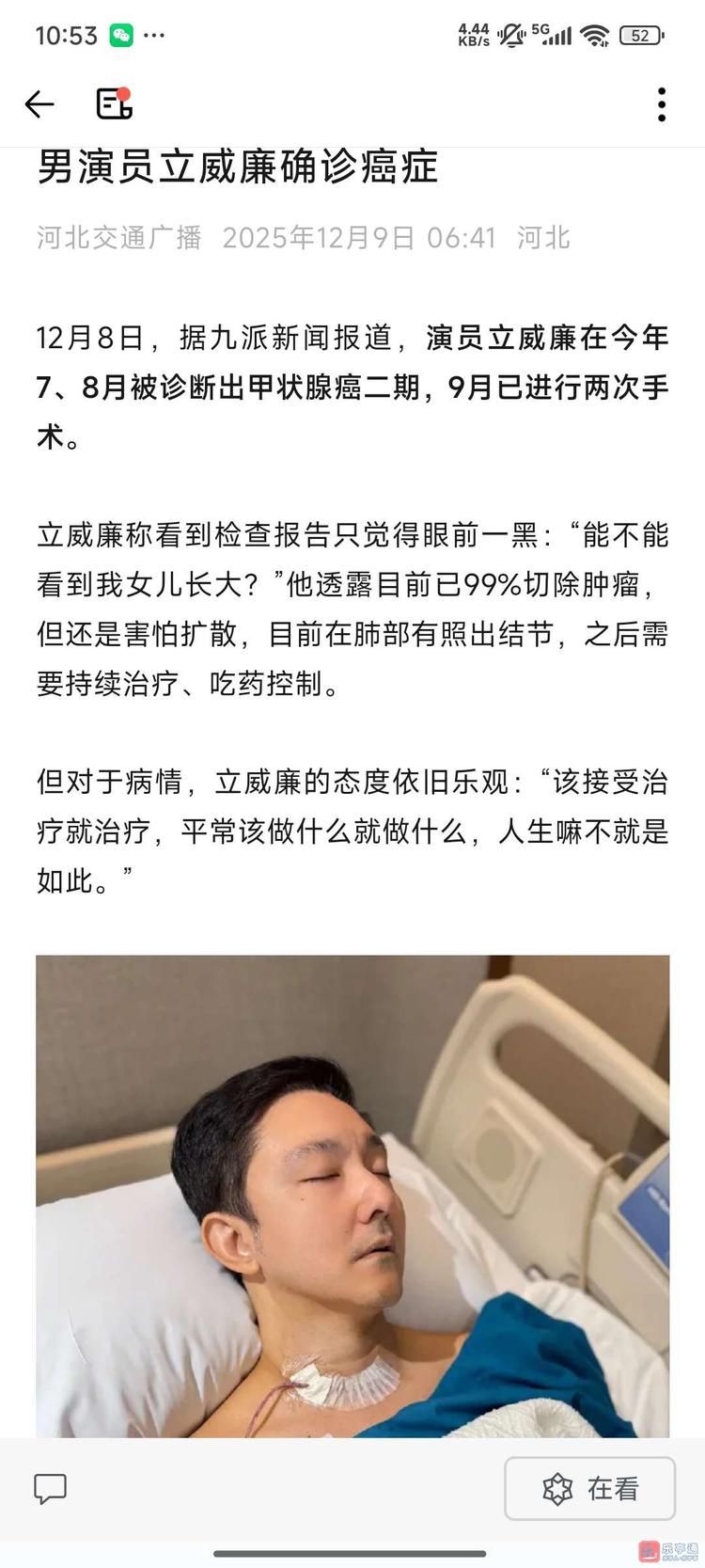 上次看到立威廉还是他发抖音,那会还感叹他是真帅啊,都不显老。早年他演的《天国的嫁衣》,追的废寝忘食,今天刷到他,居然是他确诊甲状腺癌的报道。以前觉得癌症离我很远,但现在发现患癌的几率增加了好多,还是要多关注自己的身体情况,早发现早治疗。