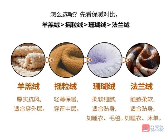 羊羔绒穿在外层,厚实抗风摇粒绒穿在中层,轻薄保暖珊瑚绒适合贴身,多见于冬天睡衣、毛毯法兰绒适合贴身,触感柔软,多见于睡衣、围巾之类的