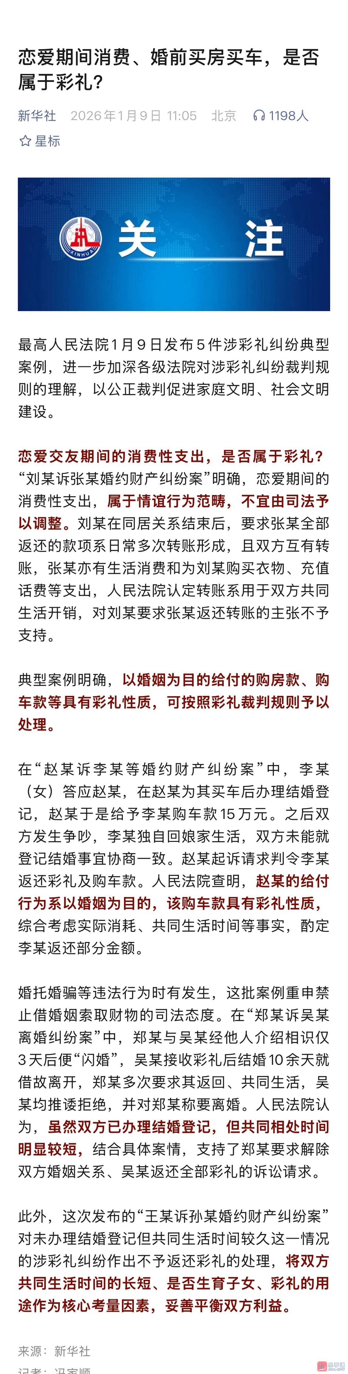 最高人民法院1月9日发布5件涉彩礼纠纷典型案例,进一步加深各级法院对涉彩礼纠纷裁判规则的理解,以公正裁判促进家庭文明、社会文明建设。恋爱交友期间的消费性支出,是否属于彩礼?“刘某诉张某婚约财产纠纷案”明确,恋爱期间的消费性支出,属于情谊行为范畴,不宜由司法予以调整。刘某在同居关系结束后,要求张某全部返还的款项系日常多次转账形成,且双方互有转账,张某亦有生活消费和为刘某购买衣物、充值话费等支出,人民法院认定转账系用于双方共同生活开销,对刘某要求张某返还转账的主张不予支持。典型案例明确,以婚姻为目的给付的购房款、购车款等具有彩礼性质,可按照彩礼裁判规则予以处理。在“赵某诉李某等婚约财产纠纷案”中,李某(女)答应赵某,在赵某为其买车后办理结婚登记,赵某于是给予李某购车款15万元。之后双方发生争吵,李某独自回娘家生活,双方未能就登记结婚事宜协商一致。赵某起诉请求判令李某返还彩礼及购车款。人民法院查明,赵某的给付行为系以婚姻为目的,该购车款具有彩礼性质,综合考虑实际消耗、共同生活时间等事实,酌定李某返还部分金额。婚托婚骗等违法行为时有发生,这批案例重申禁止借婚姻索取财物的司法态度。在“郑某诉吴某离婚纠纷案”中,郑某与吴某经他人介绍相识仅3天后便“闪婚”,吴某接收彩礼后结婚10余天就借故离开,郑某多次要求其返回、共同生活,吴某均推诿拒绝,并对郑某称要离婚。人民法院认为,虽然双方已办理结婚登记,但共同相处时间明显较短,结合具体案情,支持了郑某要求解除双方婚姻关系、吴某返还全部彩礼的诉讼请求。此外,这次发布的“王某诉孙某婚约财产纠纷案”对未办理结婚登记但共同生活时间较久这一情况的涉彩礼纠纷作出不予返还彩礼的处理,将双方共同生活时间的长短、是否生育子女、彩礼的用途作为核心考量因素,妥善平衡双方利益。![]()