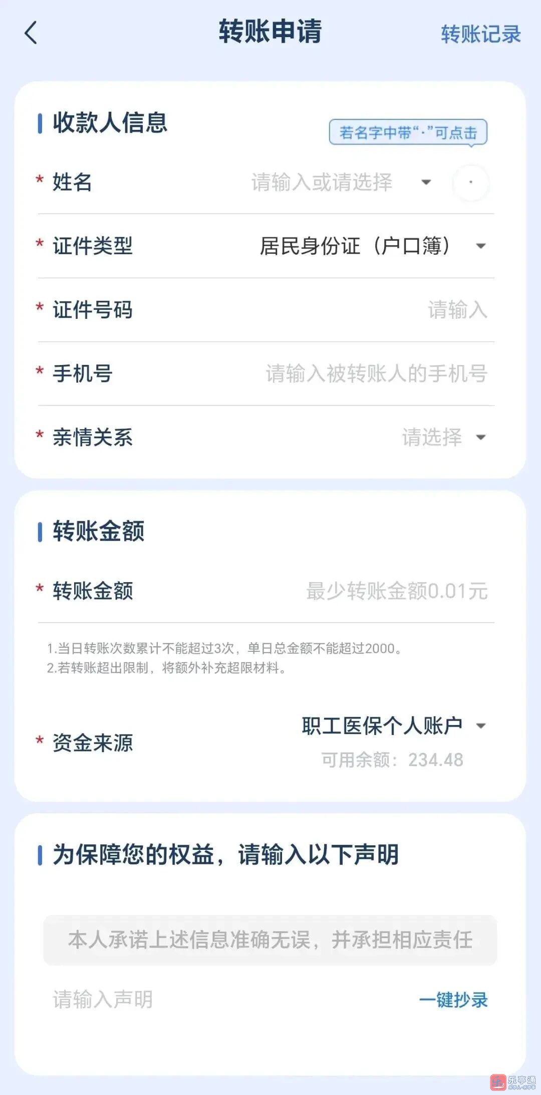 需要提示的是,每个医保钱包账户单日限3笔转账,每笔转账金额不超过2000元。
