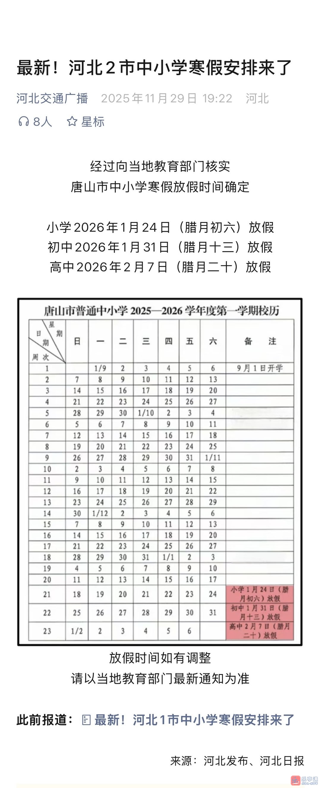 2026年唐山中小学寒假时间
