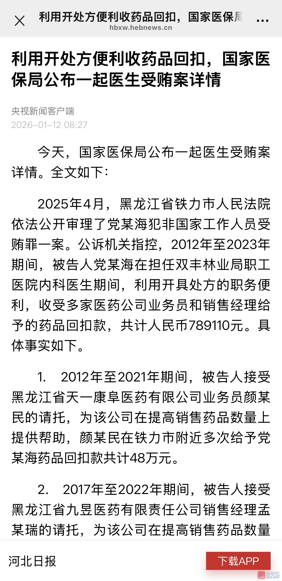 今天,国家医保局公布一起医生受贿案详情。全文如下: