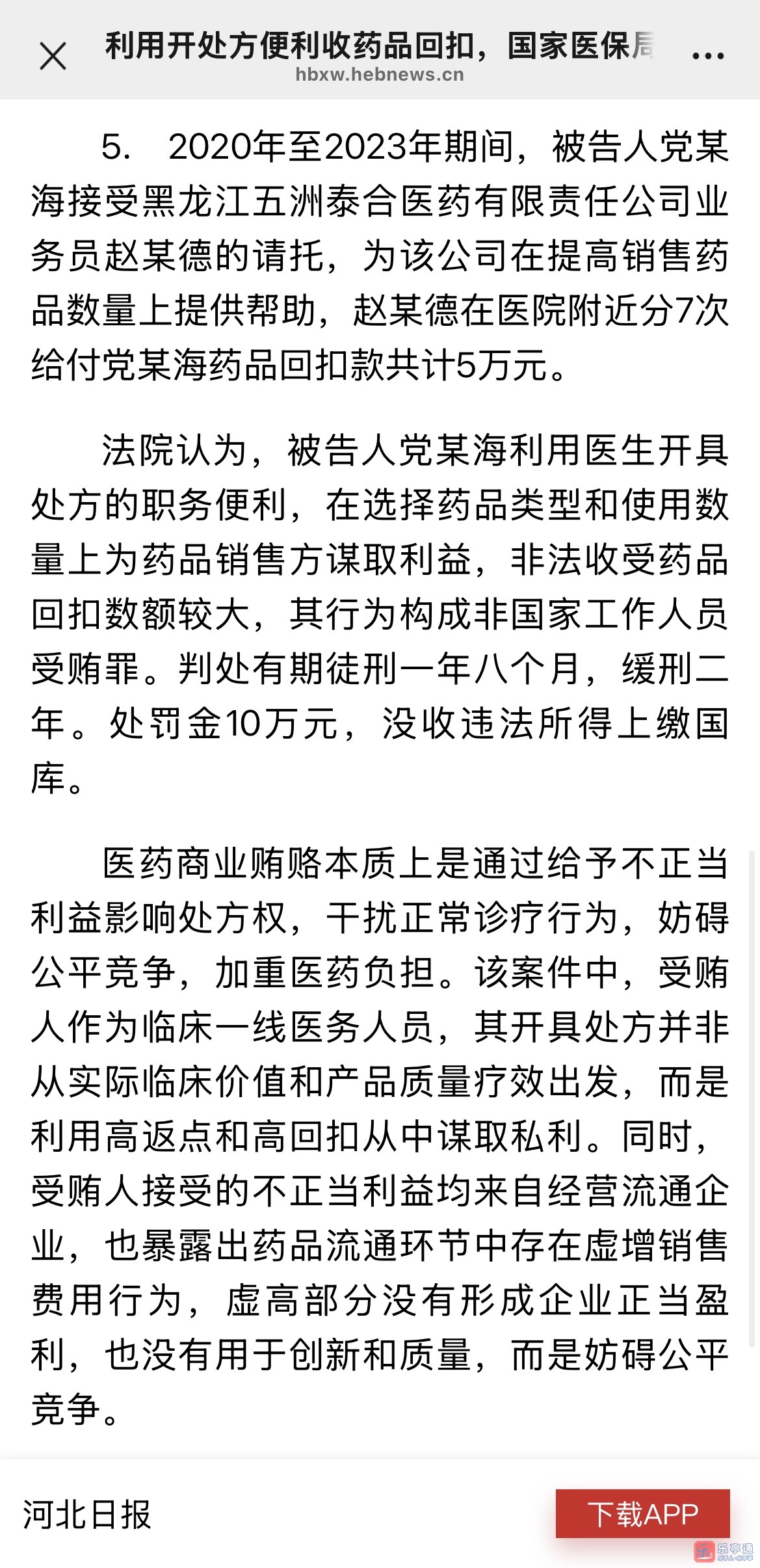 5. 2020年至2023年期间,被告人党某海接受黑龙江五洲泰合医药有限责任公司业务员赵某德的请托,为该公司在提高销售药品数量上提供帮助,赵某德在医院附近分7次给付党某海药品回扣款共计5万元。
