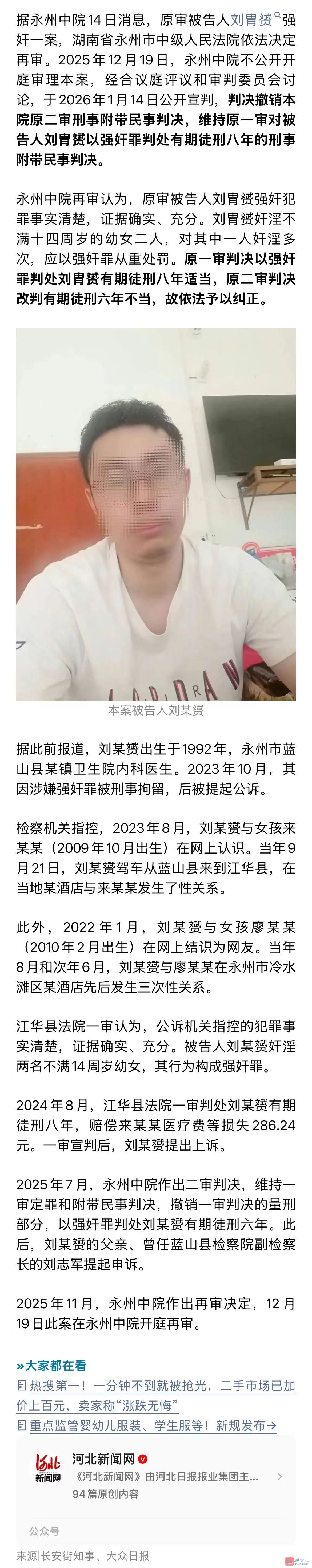 据此前报道,刘某赟出生于1992年,永州市蓝山县某镇卫生院内科医生。2023年10月,其因涉嫌强奸罪被刑事拘留,后被提起公诉。 检察机关指控,2023年8月,刘某赟与女孩来某某(2009年10月出生)在网上认识。当年9月21日,刘某赟驾车从蓝山县来到江华县,在当地某酒店与来某某发生了性关系。 此外,2022年1月,刘某赟与女孩廖某某(2010年2月出生)在网上结识为网友。当年8月和次年6月,刘某赟与廖某某在永州市冷水滩区某酒店先后发生三次性关系。 江华县法院一审认为,公诉机关指控的犯罪事实清楚,证据确实、充分。被告人刘某赟奸淫两名不满14周岁幼女,其行为构成强奸罪。 2024年8月,江华县法院一审判处刘某赟有期徒刑八年,赔偿来某某医疗费等损失286.24元。一审宣判后,刘某赟提出上诉。 2025年7月,永州中院作出二审判决,维持一审定罪和附带民事判决,撤销一审判决的量刑部分,以强奸罪判处刘某赟有期徒刑六年。此后,刘某赟的父亲、曾任蓝山县检察院副检察长的刘志军提起申诉。 2025年11月,永州中院作出再审决定,12月19日此案在永州中院开庭再审。