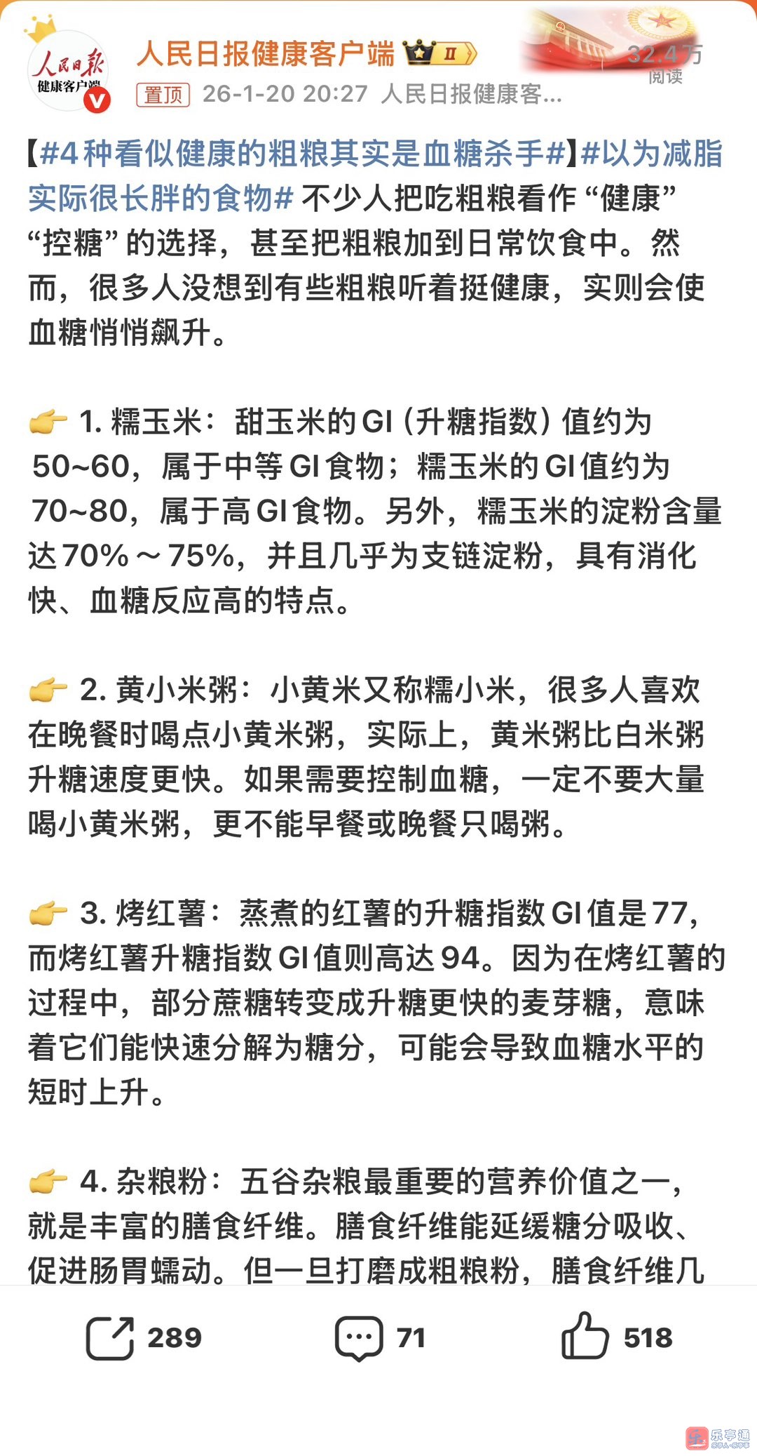 不少人把吃粗粮看作“健康”“控糖”的选择,甚至把粗粮加到日常饮食中。然而,很多人没想到有些粗粮听着挺健康,实则会使血糖悄悄飙升。