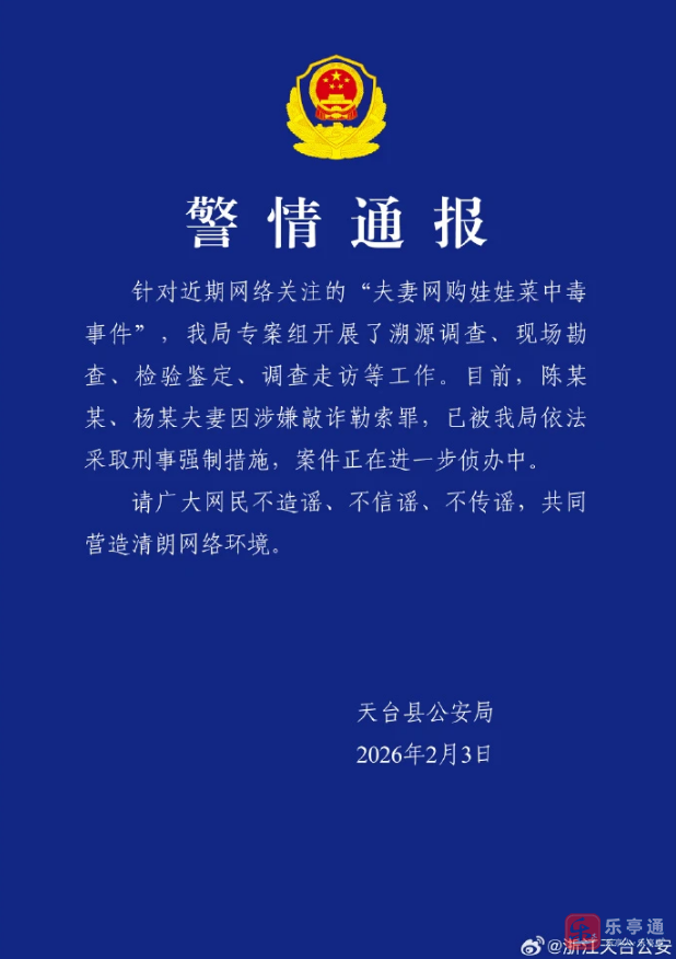 针对近期网络关注的“夫妻网购娃娃菜中毒事件”,我局专案组开展了溯源调查、现场勘查、检验鉴定、调查走访等工作。目前,陈某某、杨某夫妻因涉嫌敲诈勒索罪,已被我局依法采取刑事强制措施,案件正在进一步侦办中。