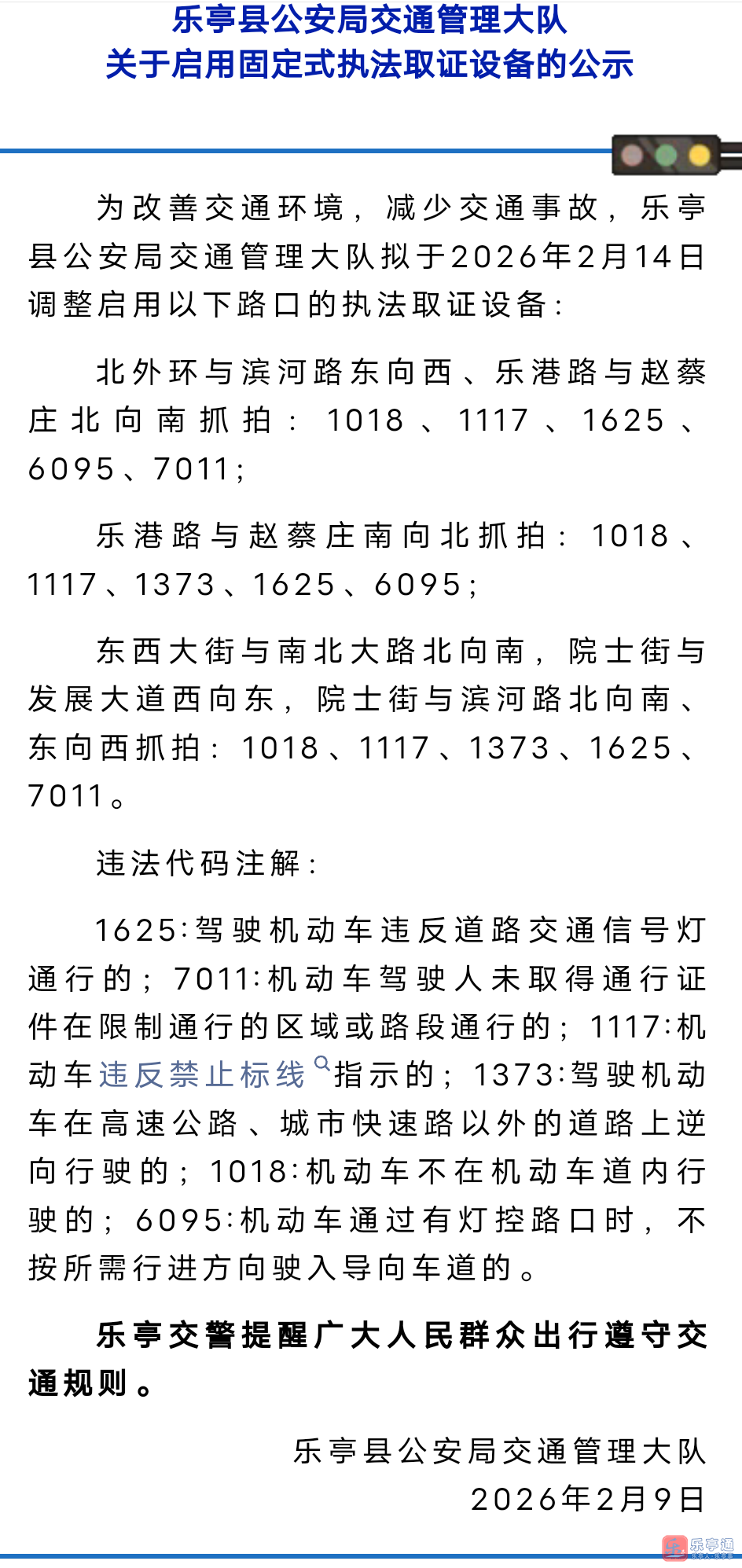 乐亭这些路口新增执法取证抓拍,2月14日正式启用!