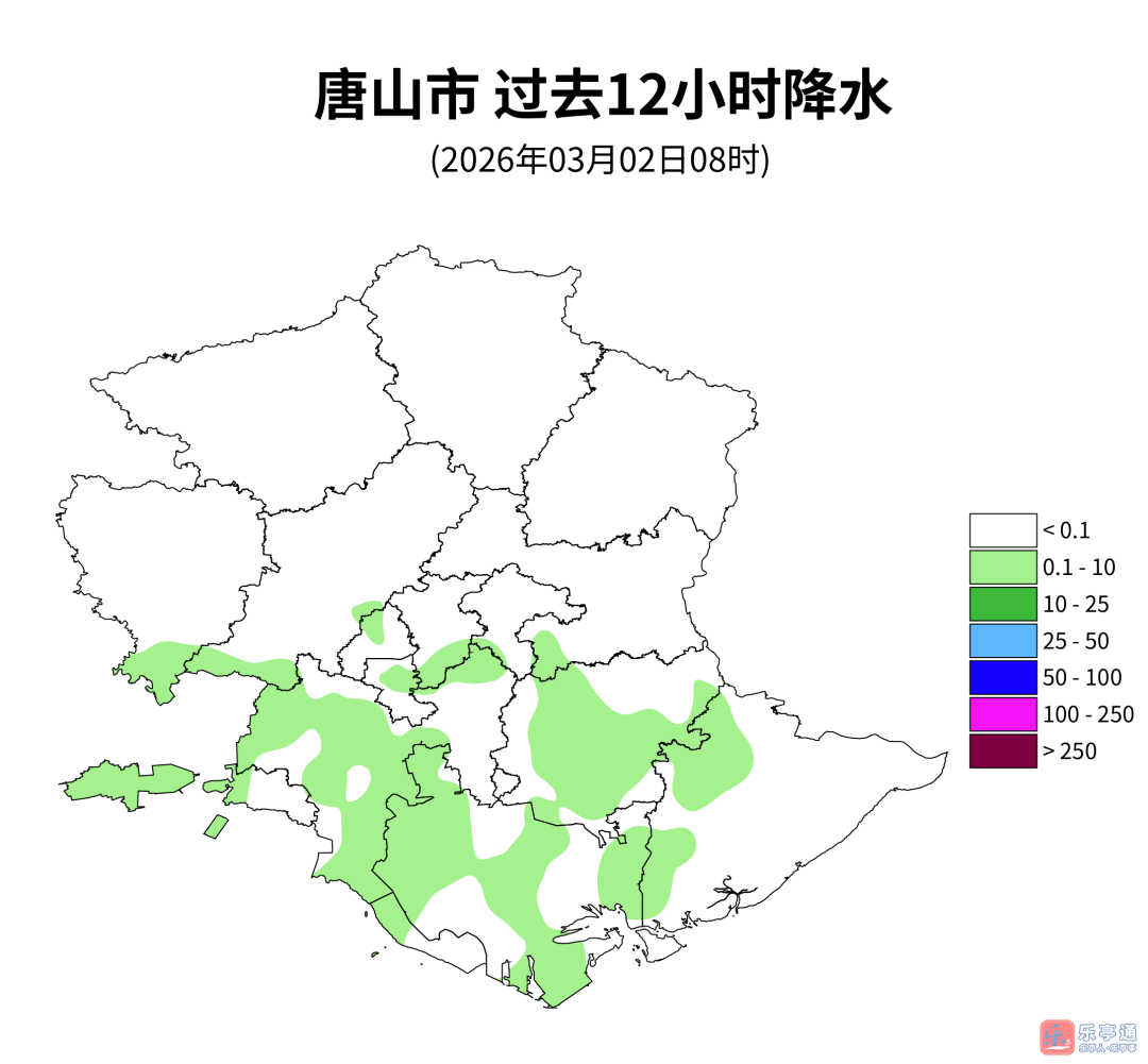 各县区平均降水量(单位毫米):市区0.2;丰南0.8;丰润0.1;玉田0.5;迁西0;迁安0;遵化0;滦州0.2;滦南0.5;乐亭0.2;曹妃甸2.0(积雪深度2cm)。