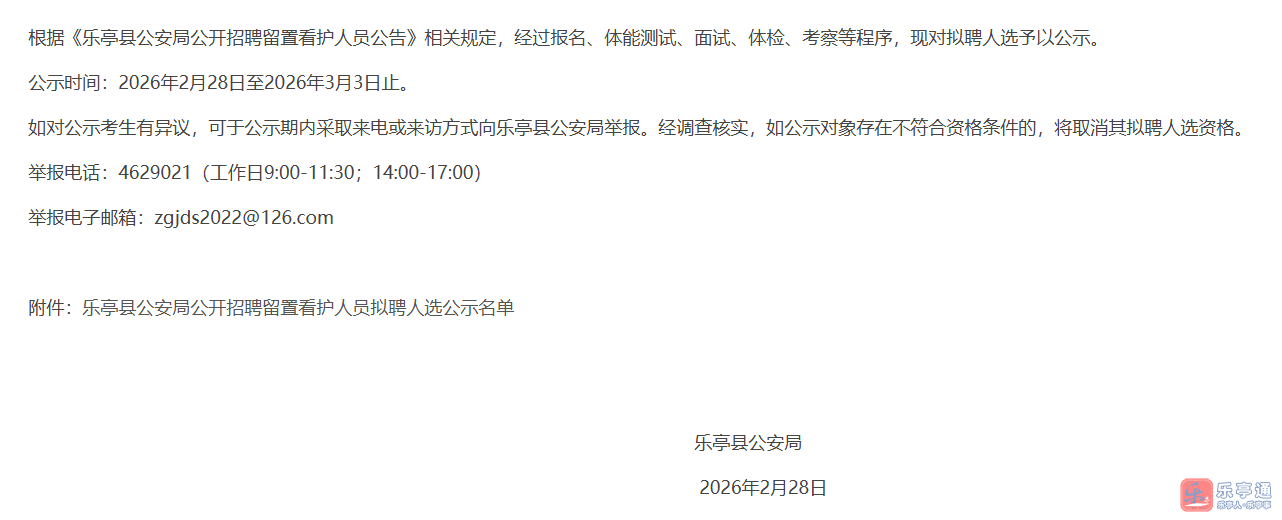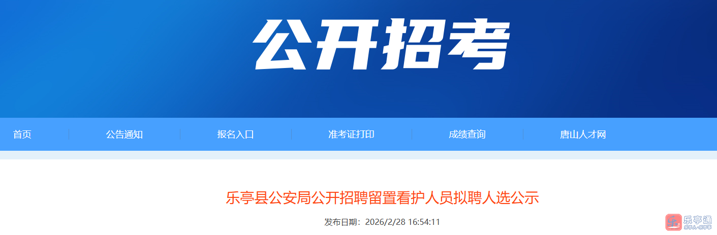 2026年乐亭县公安局公开招聘留置看护人员拟聘人选公示!