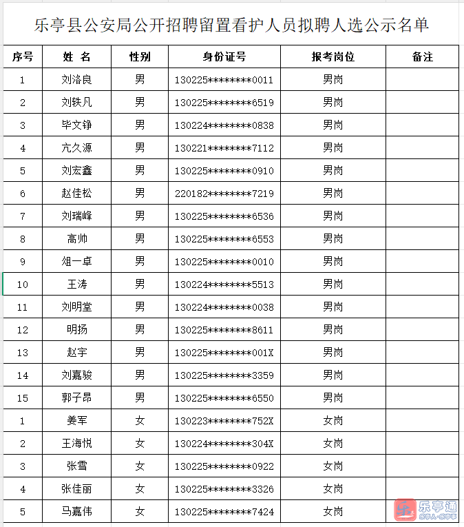 根据《乐亭县公安局公开招聘留置看护人员公告》相关规定,经过报名、体能测试、面试、体检、考察等程序,现对拟聘人选予以公示。