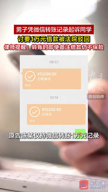 男子凭微信转账记录起诉同学,讨要1万元借款,被法院驳回;律师:转账时即使备注借款,仍不保险