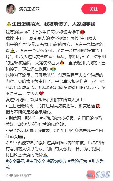 为拍网红同款视频,女演员生日当天差点毁容!“网上都说好看,我以为这是安全的......”