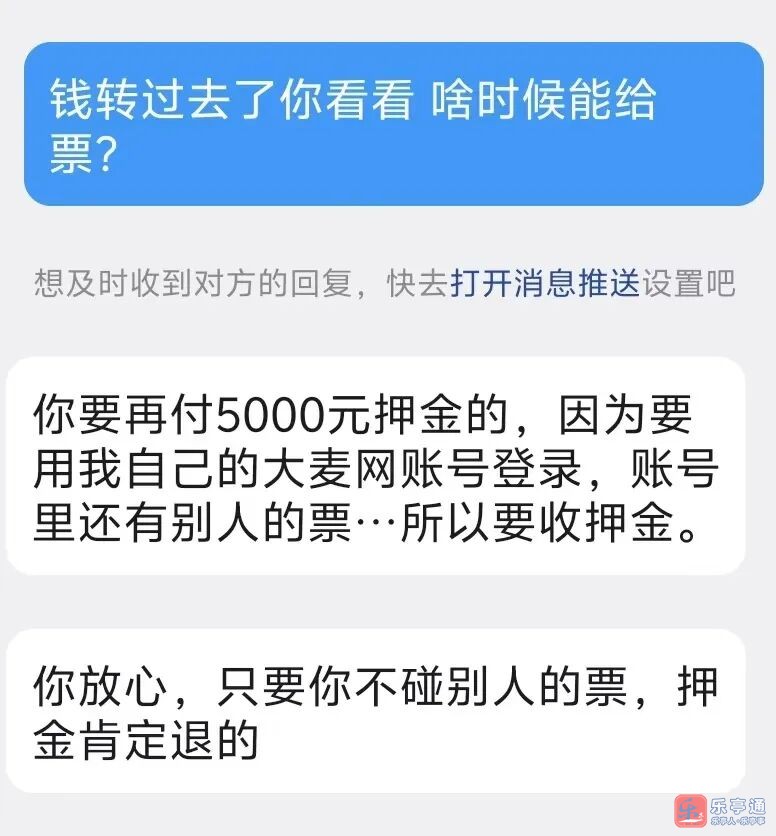 “你稍等一下,还不能登录。”对方突然叫停,“我那个大麦账号里不只有你的票,还有好几个客户的票都在包里。我怕你登录进去不小心乱动,把别人的票搞没了。这样,你再付5000元押金,保证不动账号里的东西,等你们看完演出,押金原路退回。”