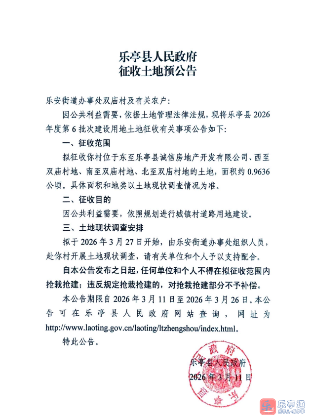 事关双庙村!乐亭县2026年度第6批次建设用地土地征收预公告