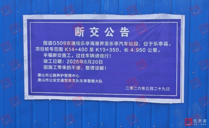 乐亭人注意:国道 G509 乐亭段半幅施工,车辆请绕行!