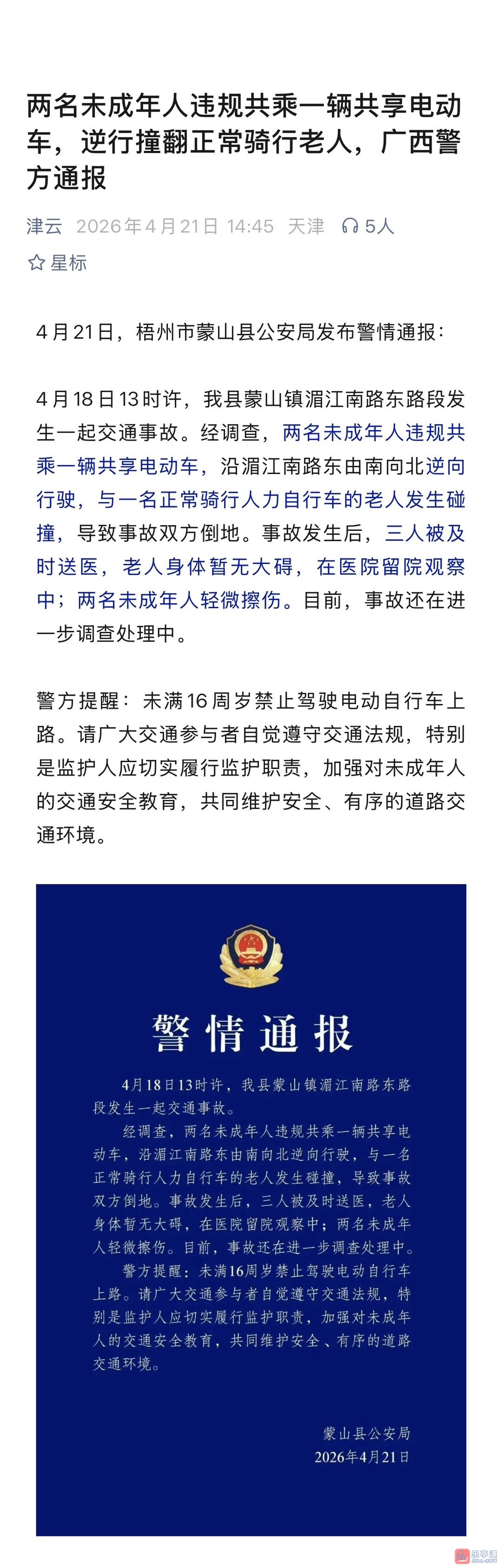 两名未成年人违规共乘一辆共享电动车,逆行撞翻正常骑行老人,被警方通报最近发现骑电动车的小男孩小女孩更多了,有两个坐一辆的,也有一个人骑的,速度很快,也不带头盔,骑车打打闹闹的,很危险的,有孩子骑的都可能是电摩托,就在机动车道上骑,也不看红绿灯,尤其是小男孩,骑车还耍酷,车行驶呢就敢双手撒开车把,都不知道害怕也不知道危险,各位家长也都注意点,别真出事了再后悔