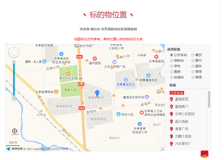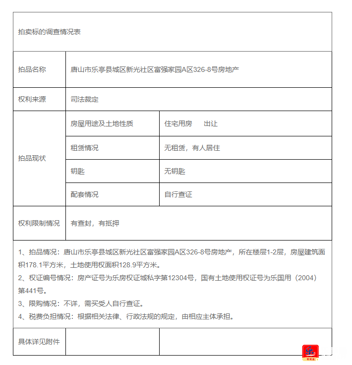 一、拍卖财产:位于唐山市乐亭县城区新光社区富强家园A区326-8号房地产,所在楼层1-2层,房屋建筑面积178.1平方米,土地使用权面积128.9平方米。