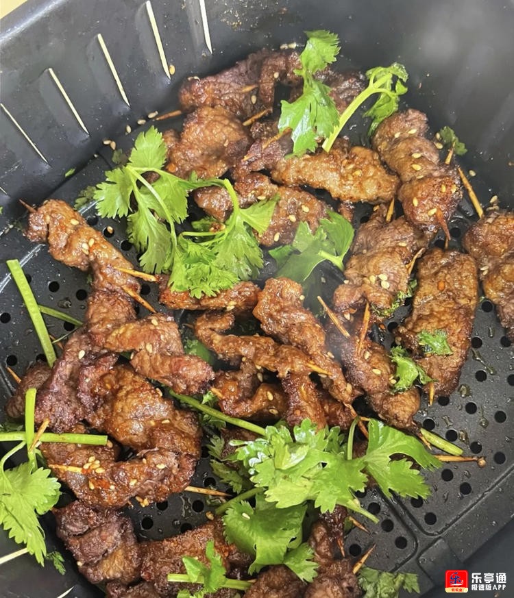 步骤2: 空气炸锅底部刷油,放入牛肉180度烤15分钟,中途翻面时加芝麻和香菜即可完全不输路边摊烧烤!啊啊啊太好吃了!通友们,一定要试试