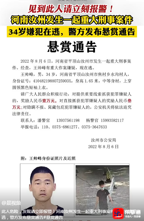王帅峰,男,34岁,河南省平顶山汝州市焦村乡水沟村人,身份证号:41048219880725903X,身高1.65米,中等身材,上穿圆领黑色短袖上衣。