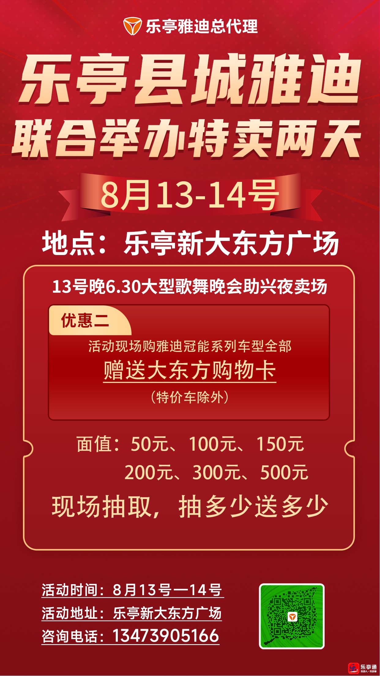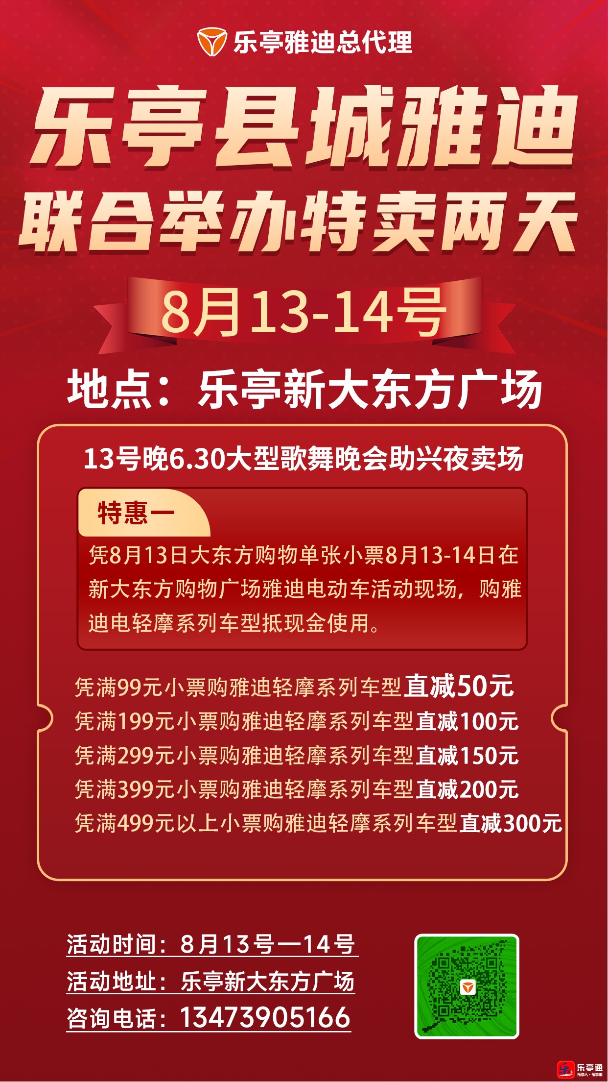 8月13号~14号(早8点~晚11点)乐亭县城雅迪电动车助力大东方超市夜卖场特惠2天