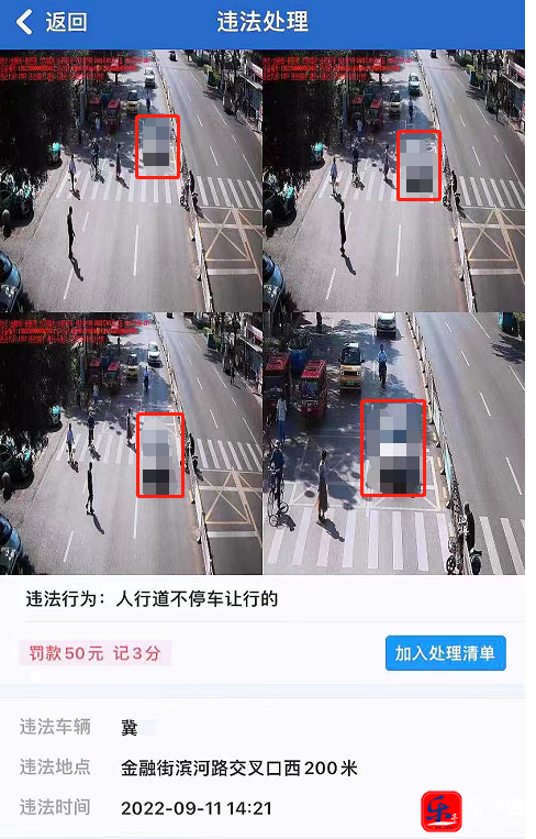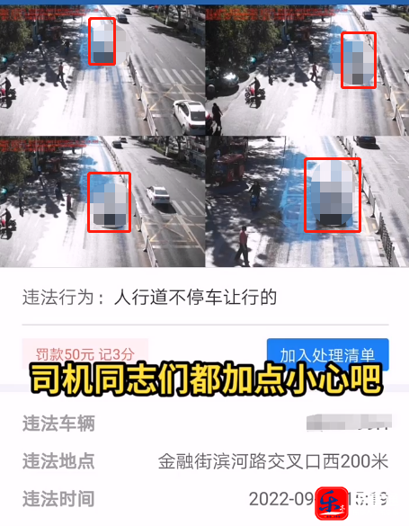 昨天收到一条短信:【唐山交警】您的小型汽车冀BJ****于2022-09-12 09:07在唐山市金融街滨河路交叉口西200米,被交通技术监控设备记录了『人行道不停车让行的』的违法行为(记3分)。请于收到本告知之日起30日内接受处理。(详情可下载登录【交管12123】APP查看并在线处理)