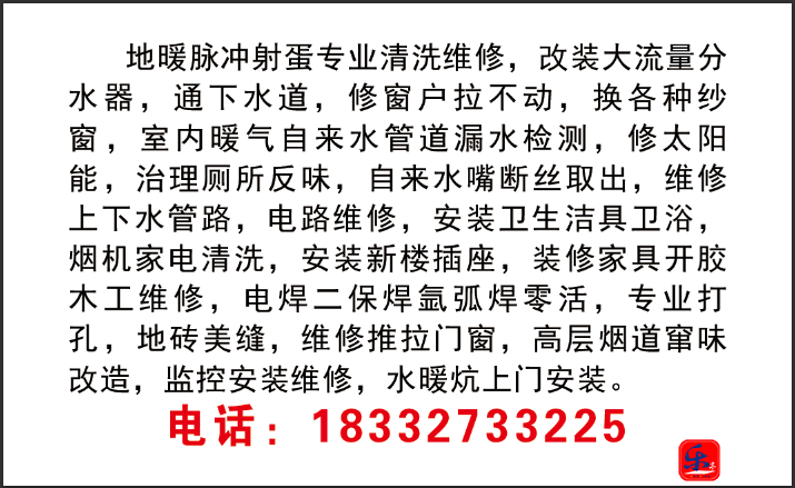 综合家政 发表于 2022-10-30 07:23 地暖脉冲射蛋专业清洗维修,改装大流量分水器,通下水道,修窗户拉不动,换各种纱窗,室内暖气自来水管道 ...