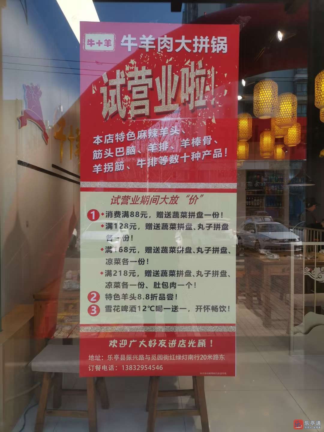 [庆祝][庆祝][庆祝]牛+羊(牛羊肉大拼锅)试营业啦! 本店特色麻辣羊头、筋头巴脑、羊排、羊棒骨、羊拐筋、牛排等数十种产品!试营业期间大放“价” 一:消费满88元,赠送蔬菜拼盘一份!满128元,赠送蔬菜拼盘、丸子拼盘各一份!满168元,赠送蔬菜拼盘、丸子拼盘、凉菜各一份!满218元,赠送蔬菜拼盘、丸子拼盘、凉菜各一份、肚包肉一个! 二: 特色羊头8.8折品尝! 三:雪花啤酒12℃喝一送一,开怀畅饮! 欢迎广大好友进店光顾!地址:乐亭县振兴路与觅园街红绿灯南行20米路东。