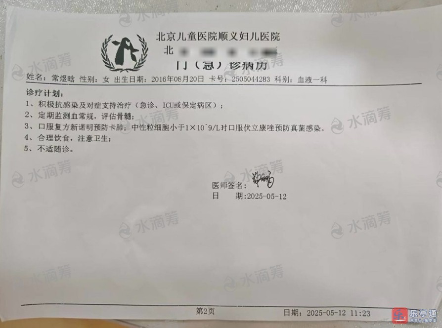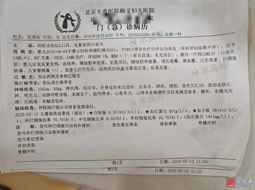 然而,命运再次跟这个家庭开了一个残酷的玩笑。在最后一个治疗阶段结束后,常煜晗出现了骨髓抑制,紧接着感染了真菌、细菌和病毒,而且都是最为严重的类型。从2025年4月28日,在唐山妇幼医院住院治疗期间,一直感染和发烧,整整14天,各种治疗手段用尽,可孩子的体温始终降不下来。心急如焚下,5月12日带孩子来到北京儿童医院,之后又转到保定区治疗。但即便换了医院,用了各种治疗方法,孩子依然高烧不退。