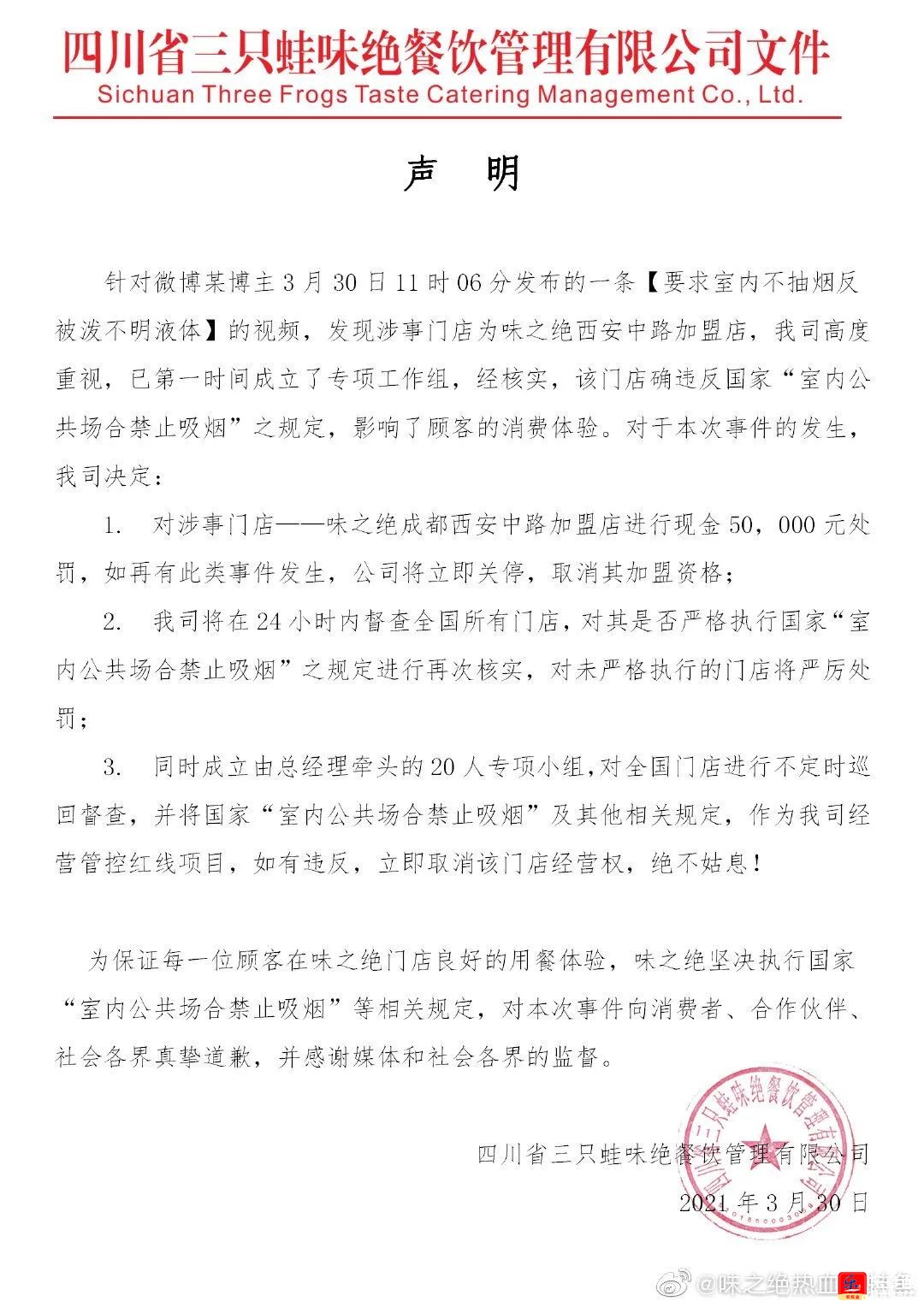 - 对于本次事件的发生,该司决定对涉事门店一一味之绝成都西安中路加盟店进行现金5万元处罚,如再有此类事件发生,公司将立即关停,取消其加盟资格;