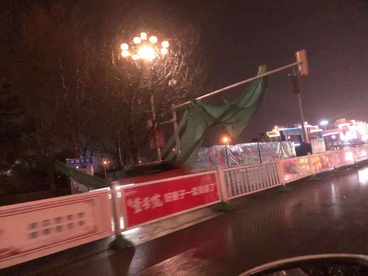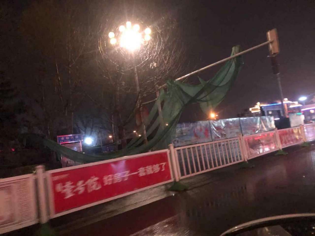 东延十字路口,绿布刮到红绿灯上了